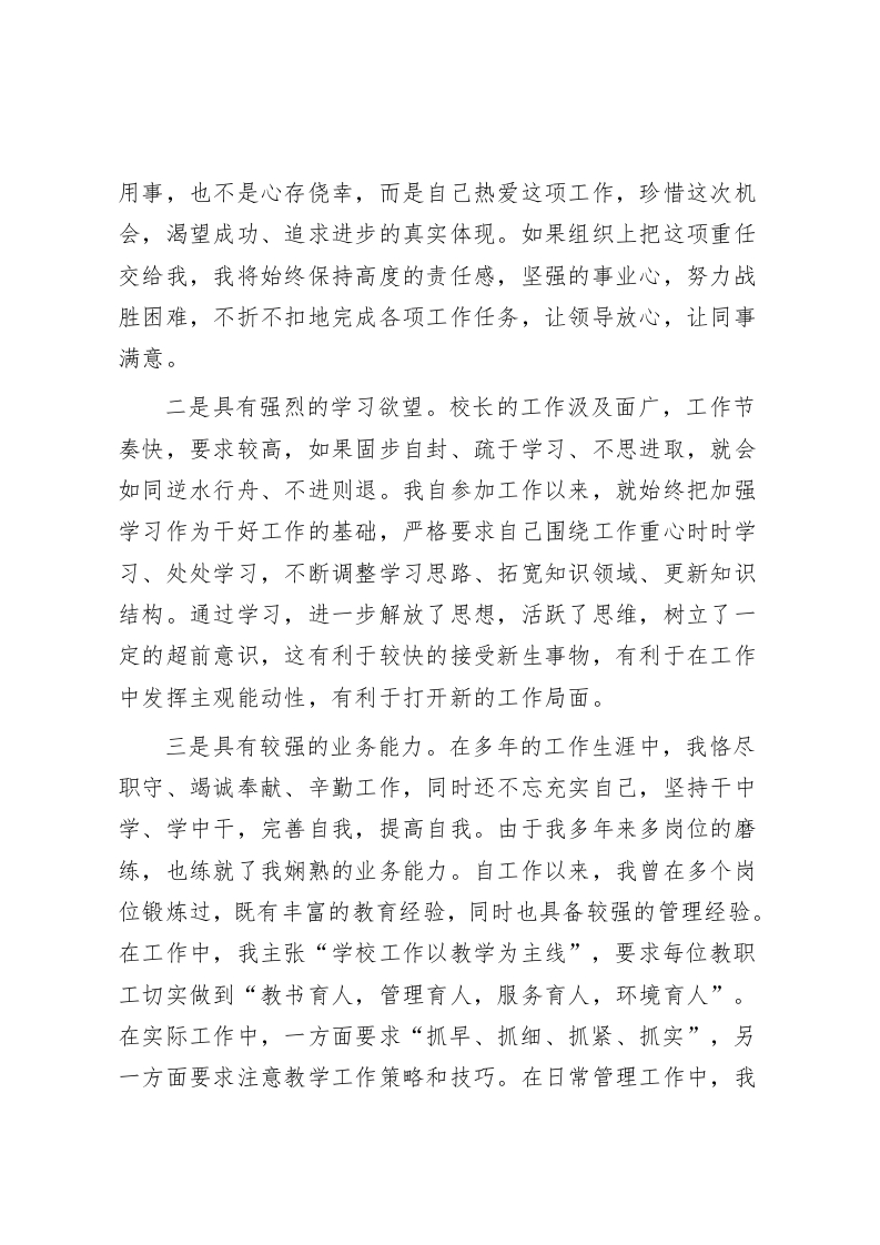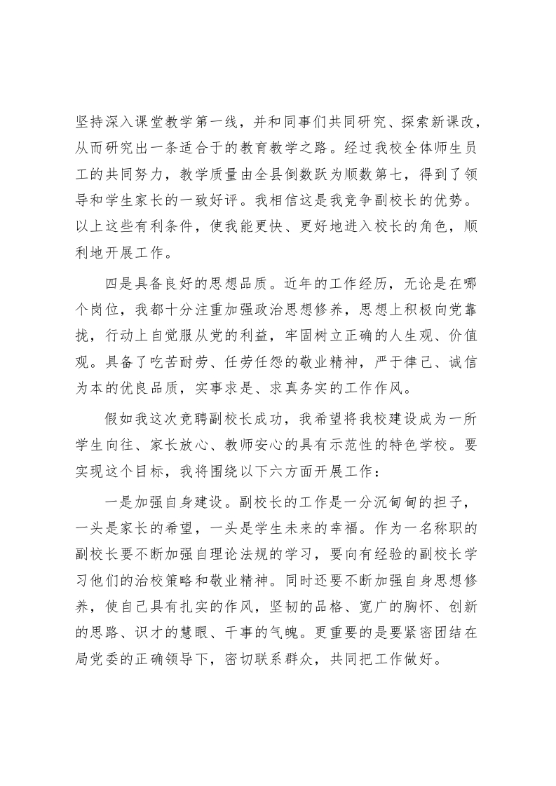 副校长竞聘讲话请各位领导和同事们相信,我就是一块砖,无论被搬到娜里我都是那最顶劲的一块砖!尊敬的各位领导、各位评委,各位同事:大家好!今天,我本着参与、锻炼、提高进而推动事业发展的目的,参与竞聘。我能有机会参加这次竞选上岗活动,心里感到非常激动,首先感谢各位领导给了我这次难得的展示自我、检验自我的机会,并借此机会对长期以来对我工作给予支持、关心和帮助的领导和同事,表示最衷心的感谢!下面,我对自己的基本情况向各位做一简单的介绍。我叫xx,今年Xx岁,中共党员,xx级教师。xx年毕业后进入担任教师,先后担任过xx、Xx等职务。从教年来,主要在教学一线;后担任副校长的5年里,前3年分管政教,后2年主持中心本部工作,分管后勤,有着较丰富的实践阅历和管理经验。我从教的这多年来,凭着对教育事业的强烈责任感,把自己的愿望和抱负都倾注在我所热爱的事业上,曾被评为Xx。面对竞聘副校长这个岗位,我想自身有如下特点和优势:一是具有勇挑重担的信心。要干好一项工作,首先必须热爱这项工作。今天,我能鼓足勇气参加这次竞争,决不是意气