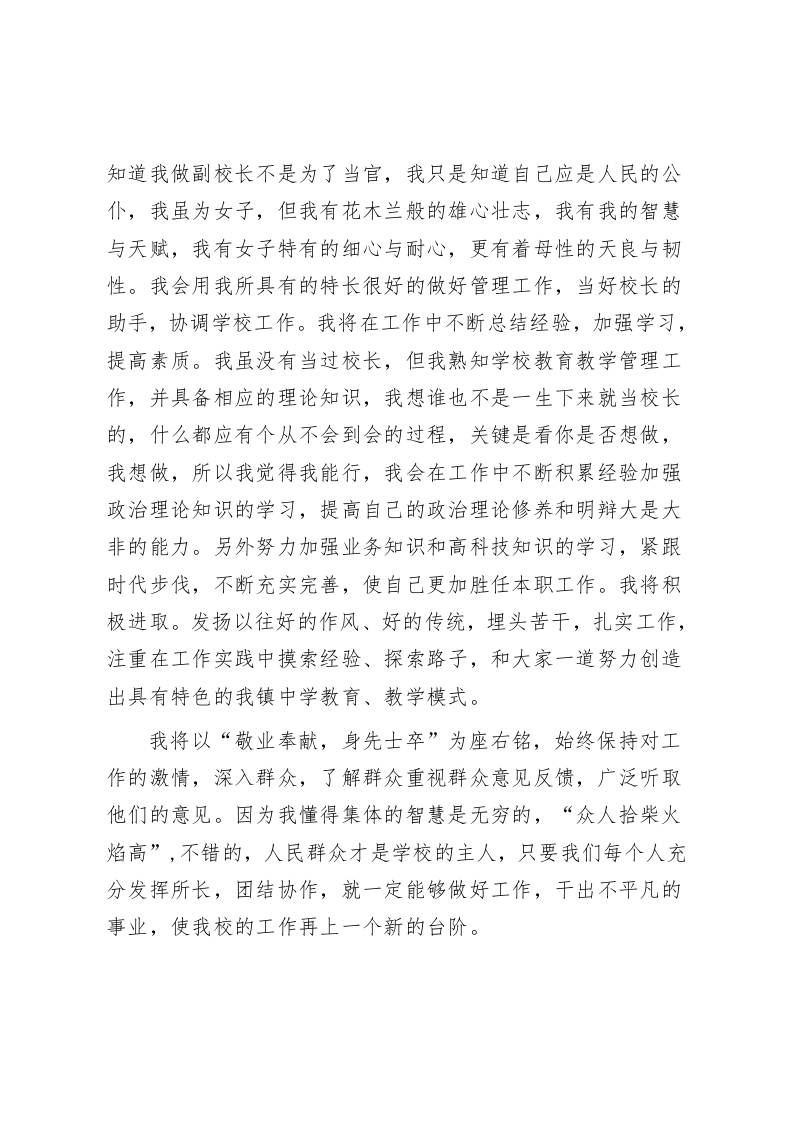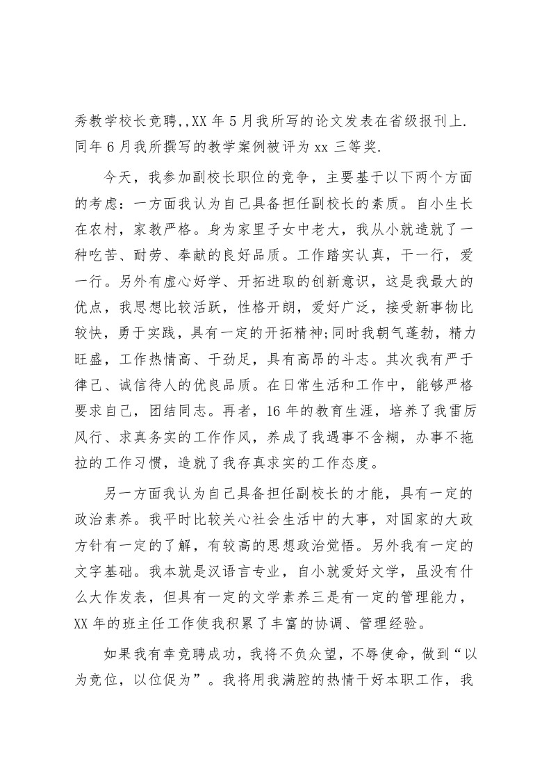 副校长竞聘演讲如果我有幸竞聘成功,我将不负众望,不辱使命,做到以为竞位,以位促为各位领导、各位评委.老师们大家好:我竞聘的岗位是xx学校副校长。教育改革如春风拂面,不自觉中我已沐浴着春风,享受着幸福。首先感谢改革的浪潮和各位领导为我提供了这个极好的锻炼自己、展现自我的机会。富兰克林有句名言:“推动你的事业,不要让你的事业来推动你。”今天,我正是为推动我的事业而来。我怀着激动的心情走上台来,非常荣幸的参加今天的竞聘演讲,我期望自己能在教改的大潮中实现自己的人生价值.我叫xx,是镇中学的一名教师,1973年4月出生,汉族,汉语言本科毕业。16年前我满怀着理想与希望深情的踏上了神圣的讲坛.从此爱上了它,并愿意为教育事业奉献终身在这宝贵的16年我当过班主任.学校少先队大队辅导员.语文教研组组长等职.岗位虽普通但我热爱我的工作,我能深深领会毛主席说的在平凡的岗位上实现自己不平凡的人生的道理,我要在平凡的岗位上干出不平凡的成绩.于是我做到了.XX年终考核别评为优秀,XX年我所带班级的语文成绩全县评比位居第二.被评为县级优秀教师,XX年上学期我所带的语文组被评为优