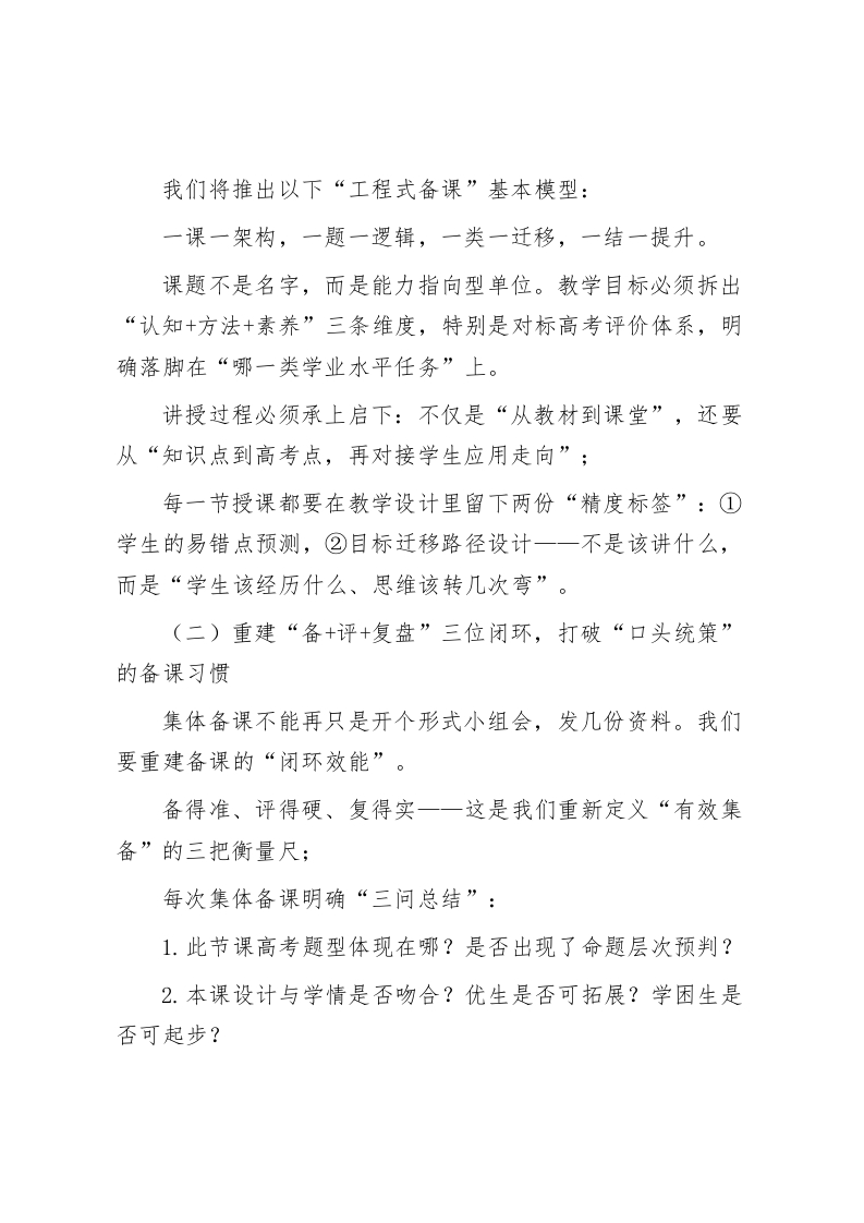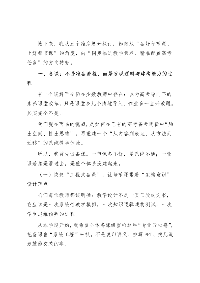 高中校长在教师会议上的讲话:聚力课堂提质,深耕素养落地各位高中部的老师们:大家下午好!今天我们坐在一起,不是为了一次例会做总结,不是只看反思材料做数据展示,更不只是强调“某个时间节点”的注意事项,而是围绕我们当下高中教学的一个重命题,从多个角度进行一次务实的系统性交流。这个核心命题就是:在新高考改革不断纵深推进的坐标系里,我们到底怎么教,怎么备,怎么稳住质量底线,又能拉出教学拔高线?坦率讲,这里没有任何人能“躺赢”,也没有哪个教师团队能“靠惯性维持状态”。只有掌握规律的人才能先人一步,只有真正下了硬功夫的人才能兜得住教学质量的“责任盘子”。我想说,未来13年依旧是高中教学“换模推进”的关键窗口期。谁能真正把“素养”落在板书上、题目里、生成中而非文件里,谁就有可能走在前头;反之,若还停留在“知识点串讲+专项刷题+猜题押题”的旧模型里,那教学的失效感只会越来越深,分数的“不确定性”只会越来越强。