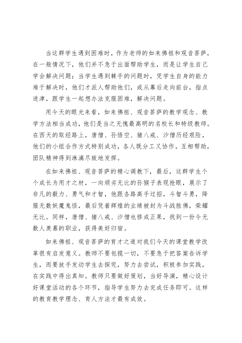 教师会议上,校长借用《西游记》指导教师管理教育学生老师们:相信《西游记》并不陌生,这是重播率最高的电视剧,最近无意间心生感悟。其实,如来佛祖、观音菩萨就是大名鼎鼎的大教育家,他们目光远大,充满智慧,老早就践行着我们今天倡导的新课程理念。我们知道,论能力和本领,如来佛祖和观音菩萨绝对是一流的,他们是名副其实的名师。如果要到西天取经的话,按他们拥有的通天彻地之能,只要他们移动金身,驾起祥云,片刻之间,即可到达西方极乐世界,轻易取得真经。可是,他们为什么没有亲自动身前往西方呢?因为他们身后还有一群顽劣不听话的学生。这群学生的名字叫唐僧、孙悟空、猪八戒、沙僧,当然还有一匹白龙马。他们无法无天,目中无人,在课堂上吵吵闹闹,顶撞老师,甚至打打杀杀,令人头痛。面对这种顽劣捣蛋的学生,如何教化他们呢?这是一个很严峻的问题。如来佛祖、观音菩萨没有亲自代替学生前去西天取经,这正是他们的高明之处。他们合力制定了明确的目标:要锻炼学生的能力,让学生亲自通过参与体验,经历九九八十一个磨难,让他们在困难中、在挫折中不断经受考验,最后茁壮成长。