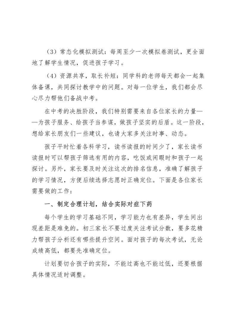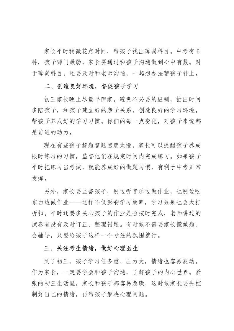九年级初三中考一模后家长会,校长讲话:明确方向,共赴中考冲刺路各位家长:你们好!谢谢你们在百忙之中抽出时间来参加今天的家长会,也谢谢两年多来大家对我们学校的支持。今天邀请家长们过来,就是希望在座的各位能和孩子一起,让学校、家长、孩子紧密联系起来,共同度过孩子初中阶段剩下的日子,以最好的状态迎接中考。所以今天的会议主要有3个部分:学校做什么?家长做什么?学生做什么?离中考仅仅一个月不到,为了能在2026年的中考中取得更好的成绩,让孩子们在人生的第一个转折点选好方向,学校做了大量工作:(1)强有力的教师队伍:初三是学校的窗口,每年的初三,都由有经验、责任心强的老师担任。我们班每一位老师都有多年带毕业班的经验,教学工作中都尽心尽力。(2)丰富的教学资源:每个老师都会充分利用多媒体教学,提高课堂容量,激发学生的学习兴趣。