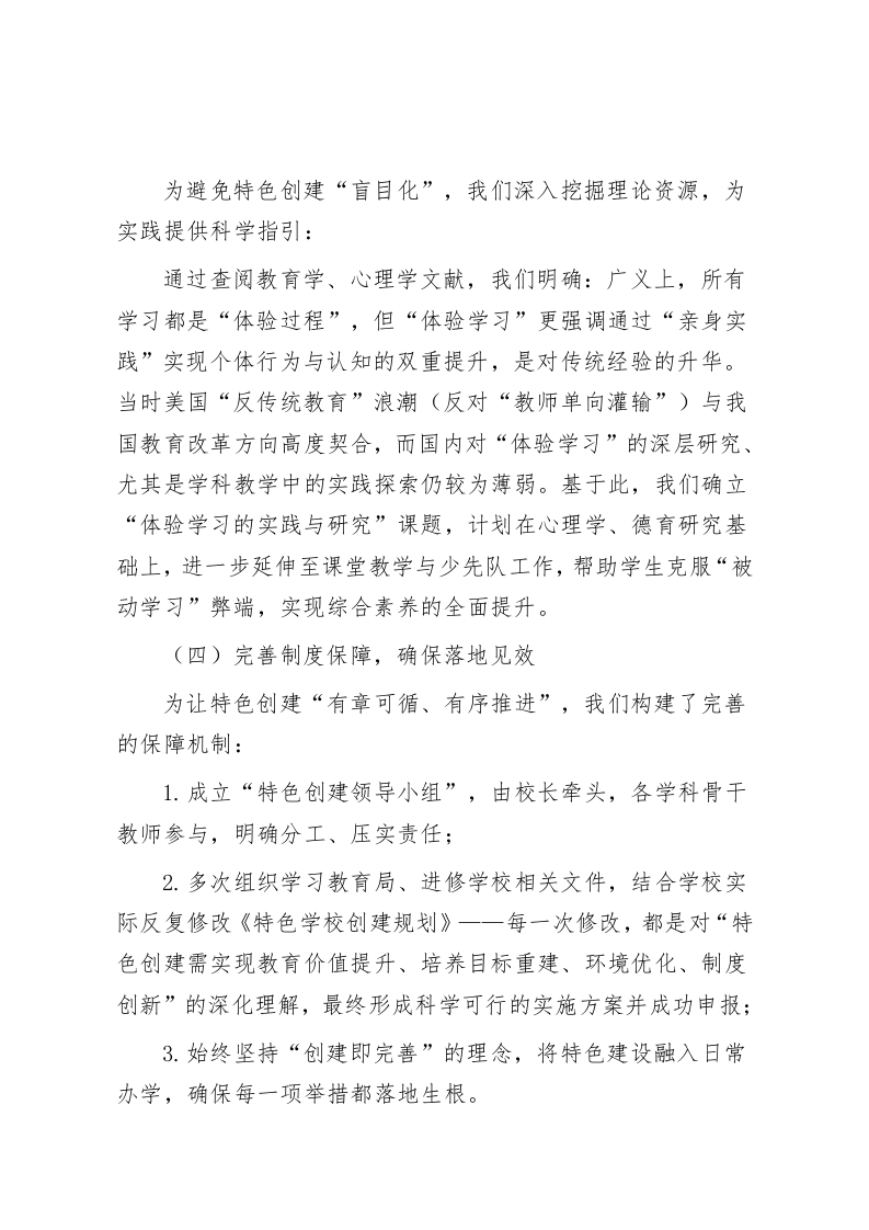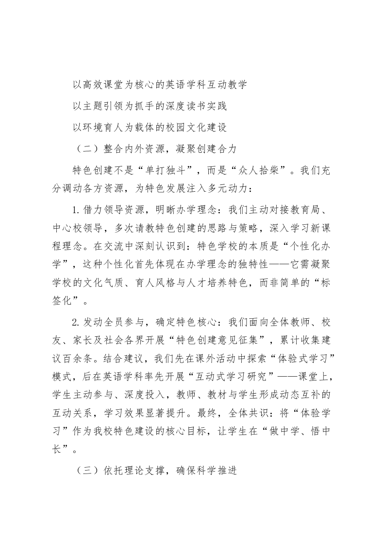 聚力特色创建,共筑教育新篇一一我校特色学校建设工作汇报尊敬的各位领导、同仁:特色学校创建,是推动学校管理精细化、内涵发展优质化、办学品位高端化的核心路径,更是每一所学校实现差异化成长的必由之路。在教育局与中心校的悉心指导和鼎力支持下,我校全体师生以饱满的热情投身特色创建工作,在探索中突破,在实践中成长,不仅收获了丰硕的办学成果,更真切体会到教育创新带来的成长喜悦。现将我校特色学校建设工作的探索与实践汇报如下:一、立足校情定方向,夯实特色创建根基特色建设的核心在于“找准定位、扎根实际”。我校始终坚持以校为本,从农村学校的地域特点、办学基础出发,在反复调研与论证中,明确特色发展路径,为创建工作筑牢根基。(一)锚定六大领域,明确探索方向结合学校实际需求与发展潜力,我们将特色建设的重点聚焦于六大核心领域,形成“多点发力、协同推进”的格局:以文化浸润为目标的读书育人活动以本土资源为依托的校本教材开发以健康成长为导向的阳光体育大课间