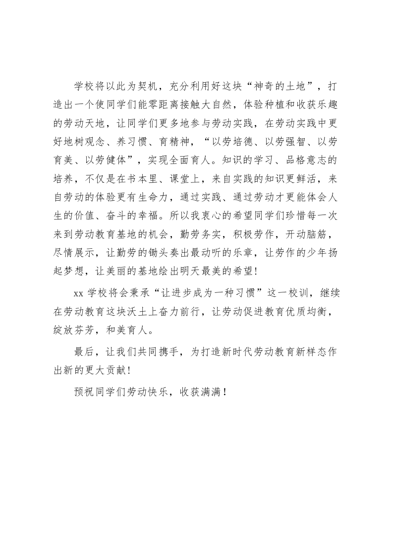 劳动教育基地揭牌仪式上,校长讲话致辞让劳作的少年扬起梦想,让美丽的基地绘出明天最美的希望尊敬的各位领导、各位来宾,亲爱的老师们、同学们:大家好!丰收的十月,大地流金;美丽的磁钟,秋色迷人。在“庆丰收、促和美”的欢庆氛围中,我们xx学校八年级三百余名师生来到xx智慧农业基地,一起见证xx劳动教育基地落地生根,一起开启新学年劳动教育崭新课程。让我们以热烈的掌声对各位领导和嘉宾的光临表示热烈的欢迎,对智慧农业基地给予我们的大力支持表示衷心的感谢,对今天为我们劳动教育课提供服务的所有人员表示崇高的敬意!劳动教育是新时代“五育”并举的重要环节,劳动教育基地的建立,是全面贯彻党的教育方针和助推“双减”工作的重要举措,是全面实践劳动教育的崭新开端。这是我们践行“让每一朵花都朝着阳光的方向自由生长”学校理念的具体举措,更是xx学校对新时代劳动教育课程的积极探索和创新。同学们又多了一个广阔的劳动实践空间,这场仪式是今秋送给同学们最好的礼物。
