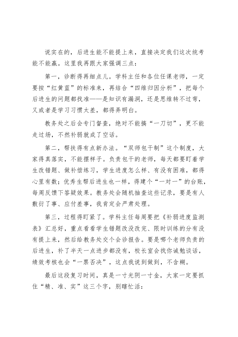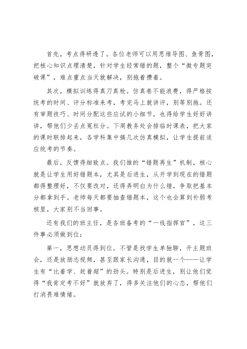 期中统考备考动员教师大会上,校长讲话:凝心聚力,精准攻坚,决胜统考各位老师:下午好啊!今天把大家召集过来,开这个期中统考备考再动员会,核心就一句话一一我们得一起使劲、精准发力,把这次统考拿下来!首先我必须跟大家说声辛苦:这段时间大家在教学一线连轴转,备课、上课、盯学生,没少费心。也正是因为大家这么拼,我们的备考工作才能一步步推进,有了现在的阶段性成效,这点值得肯定!不过现在不是松劲的时候,期中统考眼看就要到了,我们已经进入冲刺的关键期了。之前校长室推的那个《后进生精准补弱实施方案》,大家执行得不错:各学科都把“红黄蓝”三级预警的学生梳理出来了,还给每个孩子做了个性化帮扶计划,优秀生帮后进生答疑也做到了全覆盖,这步走得特别实。但我们也得认清现实一一现在低分段的学生占比还是偏高,有些学科的限时训练里,后进生得分还是上不去。我们定的统考目标就在那,剩下的时间不多了,我们必须拿出“背水一战”的劲头,把精准补弱、科学复习、全员动员这三件核心事儿抓牢抓实。