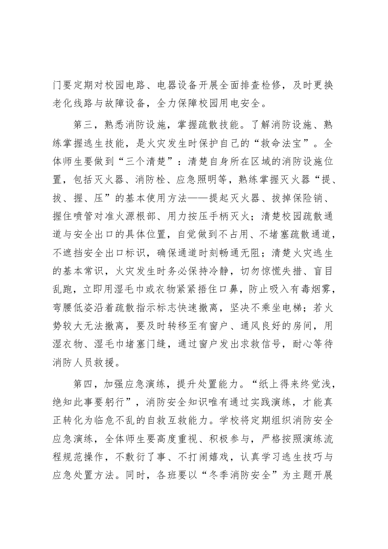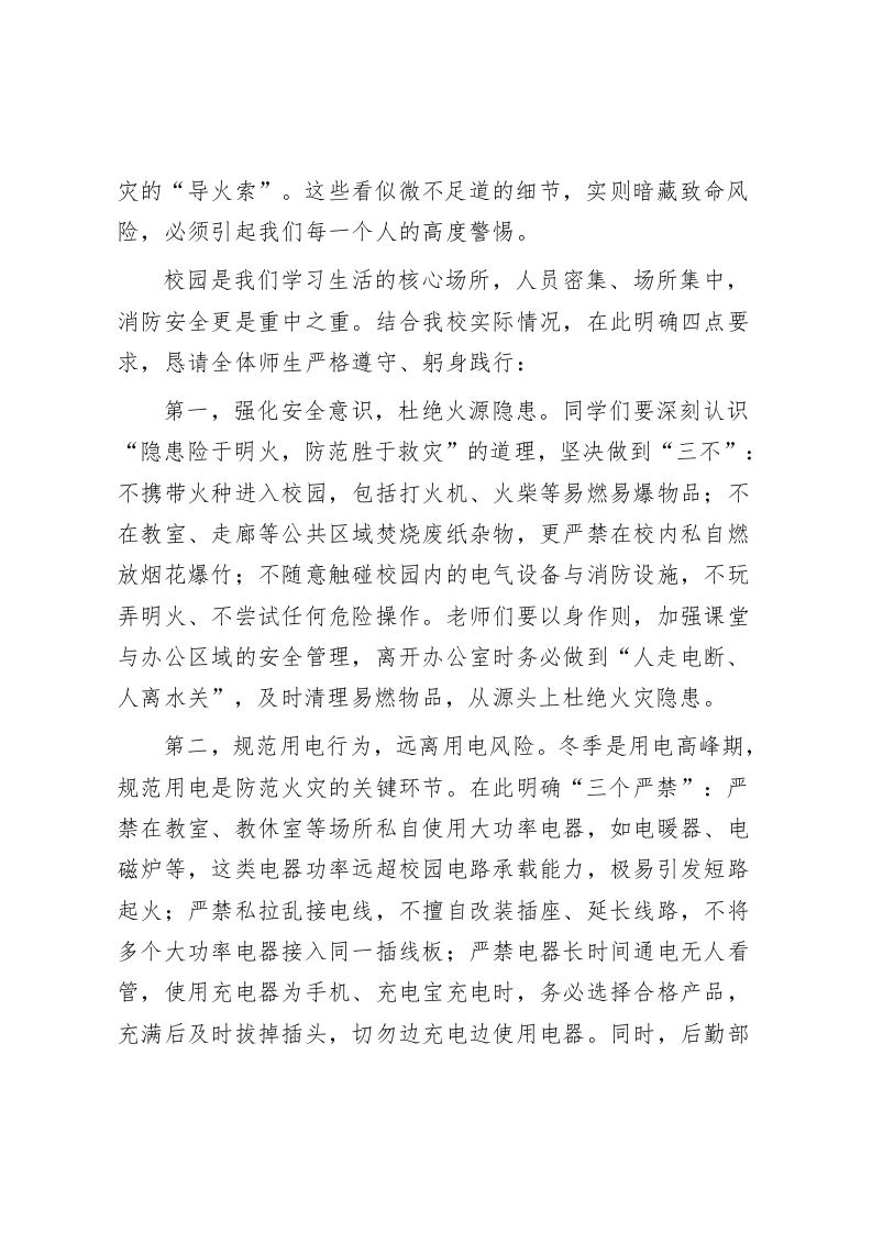 消防安全主题,校长国旗下讲话:牢记消防使命,守护平安校园老师们、同学们:大家早上好!今年11月9日,我们将迎来第34个全国消防日,本届消防宣传月的主题是“全民消防、生命至上一一安全用火用电”。这短短十二字,既是对生命尊严的敬畏坚守,更是对每一位公民责任的郑重召唤。消防安全,从来都不是孤立的个体议题,它关乎着我们每个人的生命财产安全,维系着校园的和谐稳定,更牵动着千家万户的幸福美满。今天,我和大家共同学习冬季消防安全知识,筑牢校园安全屏障。消防安全,是一条绝对不可逾越的“生命红线”,容不得半点懈怠,更经不起一丝侥幸。数据显示,冬季火灾发生率占全年四成以上,其中校园周边及校园内发生的火灾,多与用电不规范、消防安全意识薄弱密切相关。冬季气候干燥,木材、纸张、衣物等易燃物品含水量极低,一旦接触火源,极易引发火势蔓延;同时,冬季门窗紧闭,室内空间封闭,一旦发生火灾,烟雾和有毒气体无法及时扩散,会大大缩短逃生时间,加剧危险程度。随着冬季取暖需求攀升,电暖器、充电器等电器设备的使用频率显著提高,若操作不当一一比如电器长时间通电、插头插座老化破损、私自改装线路等,都可能成为引燃火