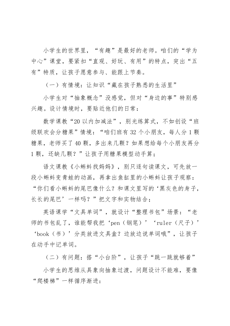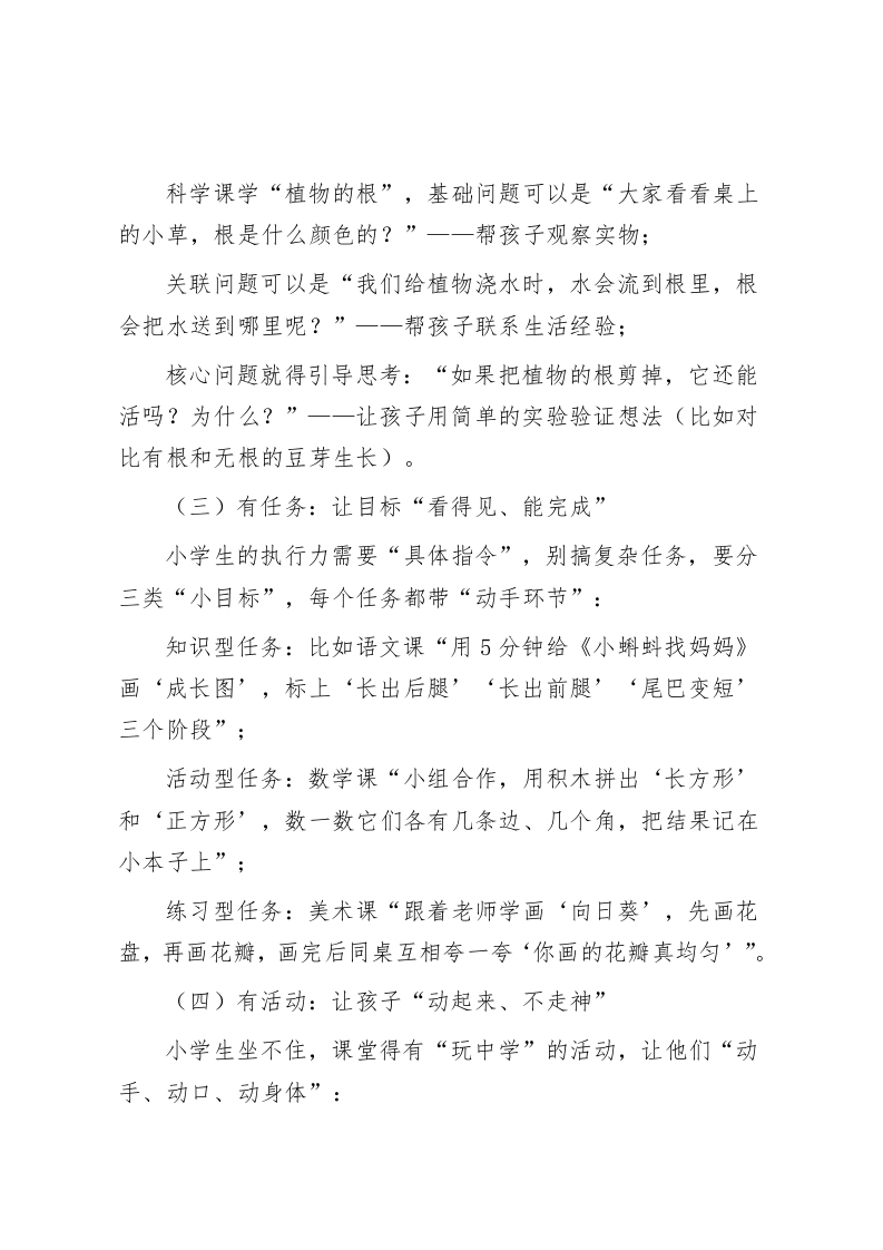 小学副校长在全体教师大会上讲话:以“学为中心”,打造小学高效课堂新样态各位老师:大家上午好!新学期开学这段时间,我常去各班听课,也和不少老师聊起课堂:“低年级孩子坐不住,讲十分钟就开始玩文具”“高年级孩子不爱举手,问问题总没人回应”“想让孩子主动学,可他们就喜欢等着老师讲答案”。这些困惑,其实都指向同一个核心一一怎么让小学课堂“活”起来,让“学”真正成为孩子的主动选择。今天,我想结合咱们小学的教学实际,和大家聊聊“以‘学为中心’构建高效课堂”。这不是否定咱们过往的教学,而是因为小学生正处在“习惯养成、兴趣培养”的关键期,咱们的课堂不能只教知识,更要让孩子“爱学、会学”,在玩中学、做中学。接下来,我从课堂样态、落地路径、保障支持三个方面,和大家分享具体想法。一、先明方向:“学为中心”的小学课堂,该有这“五有”样子