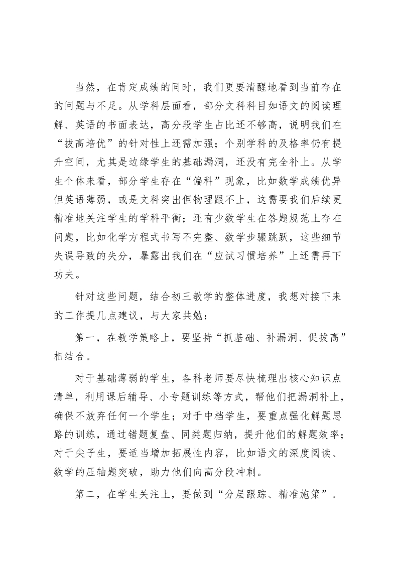 校长在初三第一次月考质量分析会上的发言稿各位初三教师同仁:大家下午好!今天我们召开初三第一次月考质量分析会,既是对开学以来教学工作的阶段性复盘,也是为接下来冲刺中考的关键环节校准方向。首先,我要代表学校,向在座每一位老师道一声感谢一一开学以来,大家围绕初三教学目标,深耕课堂、细化辅导,牺牲了不少休息时间,这份对学生、对教学的责任心,值得我们所有人肯定。从这次月考的整体数据来看,我们看到了不少积极的信号:多数学科的平均分较入学摸底有明显提升,尤其是数学、物理学科的中档题正确率,比去年同期提高了8%-10%,这说明大家在基础知识巩固和解题方法指导上的努力,已经初见成效:部分班级的优秀率突破了30%,还有几个班级的及格率实现了100%,这些成绩的背后,是班主任与科任老师的紧密配合,是大家针对不同学生特点制定个性化辅导方案的成果。更让我们欣慰的是,从学生问卷反馈来看,85%以上的学生认为“课堂能跟上老师思路”“遇到问题能及时得到老师帮助”,这份师生间的信任与默契,正是我们后续提升教学质量的重要基础。