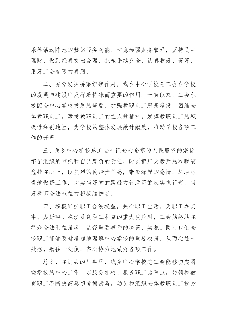 校长在工会换届选举中讲话以服务学校,服务职工为重点各位工会会员:上午好!今天按时按程序完成了工会主席、副主席及委员换届选举工作。首先对本次选举工作的顺利进行表示热烈祝贺!其次向全体工会会员表示衷心的感谢!同时,也向今天当选的新一届工会主席、副主席及各位委员同志表示热烈祝贺!近几年来,我乡中心学校在各级领导的正确指导和支持下,团结全体教职员工,强化常规管理,改善各校办学条件,优化育人环境,使各校的教育质量、办学声誉不断提高。学校工作方方面面所取得的成绩,应该说与基层工会的努力工作是分不开的。下面,针对工会工作简要总结几点。一、努力加强自身组织建设。多年来,我乡中心学校总工会能根据形势需要和上级要求,采取有效措施,大力加强工会自身改革与建设,每项工作都超前研究,精心设计,逐步把工会工作从过去的福利娱乐型向多功能型转变,增强了工会组织的吸引力和凝聚力。及时传达上级工会有关会议和文件精神,研究部署工作,对工会干部不断提出新要求。重视“教工之家”建设,加强活动阵地的硬件和软件建设,努力提高工会宣传娱
