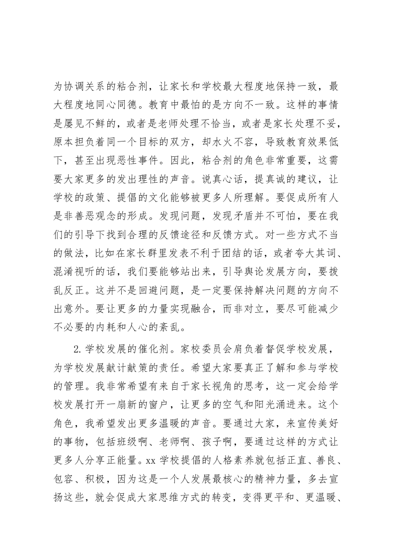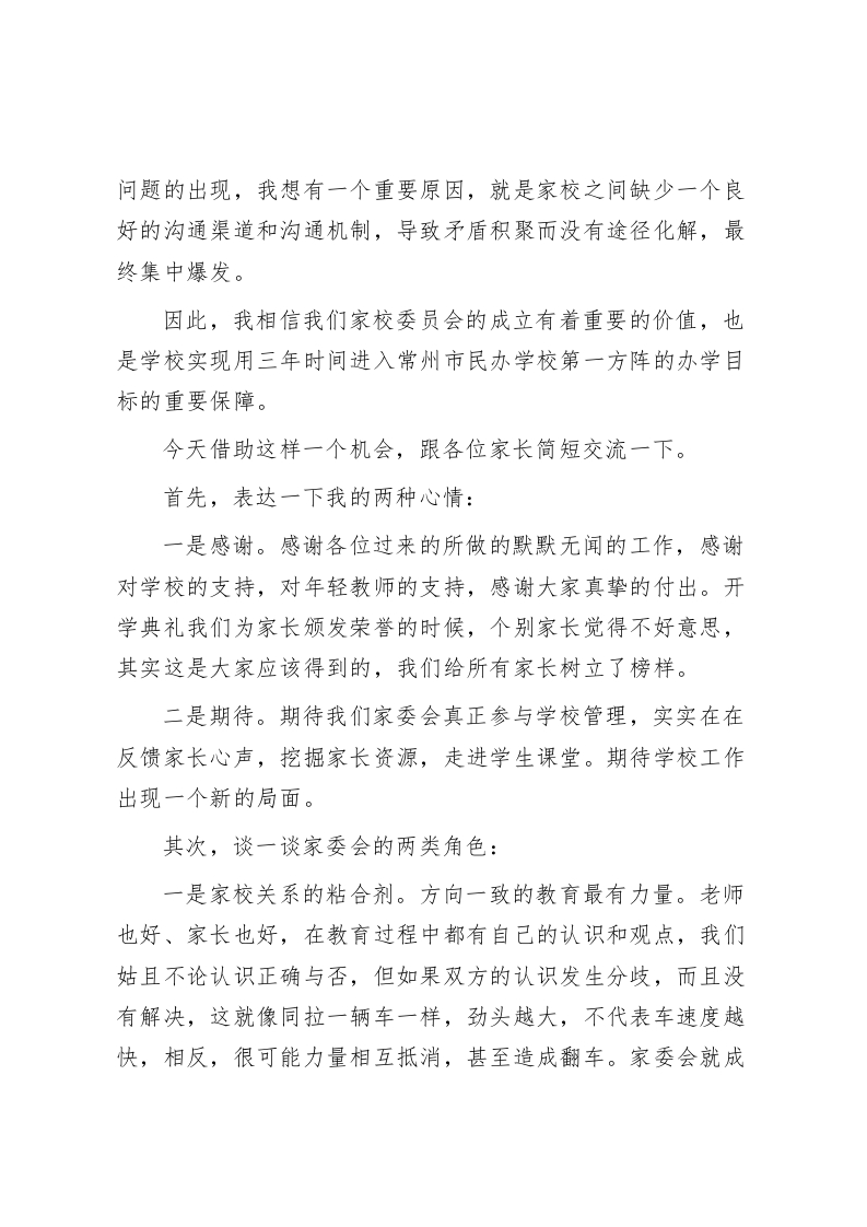 校长在家委会上演讲家校合育,催生更大的力量尊敬的各位家长委员们:下午好!今天对xx学校来说,是个特别的日子,毫不夸张地说,今天这个日子必将写进学校的历史,我们各位也将成为学校发展的重要见证人。因为今天是第一届家委会成立的日子,有着特殊的意义。我认为,一所优秀的学校一定是开放的学校,能够集各方力量于一体。在学校的三年规划和顶层设计中,学校由四个机构支撑学校发展,即专家委员会、校务委员会、教职工代表大会、家长委员会。其中家长委员会的价值就在于借助社会力量监督学校办学,并为学校发展保驾护航。我们知道,一个人的成长,离不开学校、家庭、社会三个方面的教育。从大的时代背景来说,目前中国社会正进入转型阶段,人们的思想观念、行为方式、消费观念和以前相比有了根本性的改变。这种转型对学校教育的冲击越来越大。个别学生在校内外发生的某些不良行为和现象,作为学校、老师有时感到力不从心!甚至有时还要遇到家长的误解和责难。家校矛盾丛生。最近一段时间频繁出现的恶性事件,触目惊心。作为校长,我经常用几个词来形容自己的工作,那就是战战兢兢、如临深渊、如履薄冰。这些