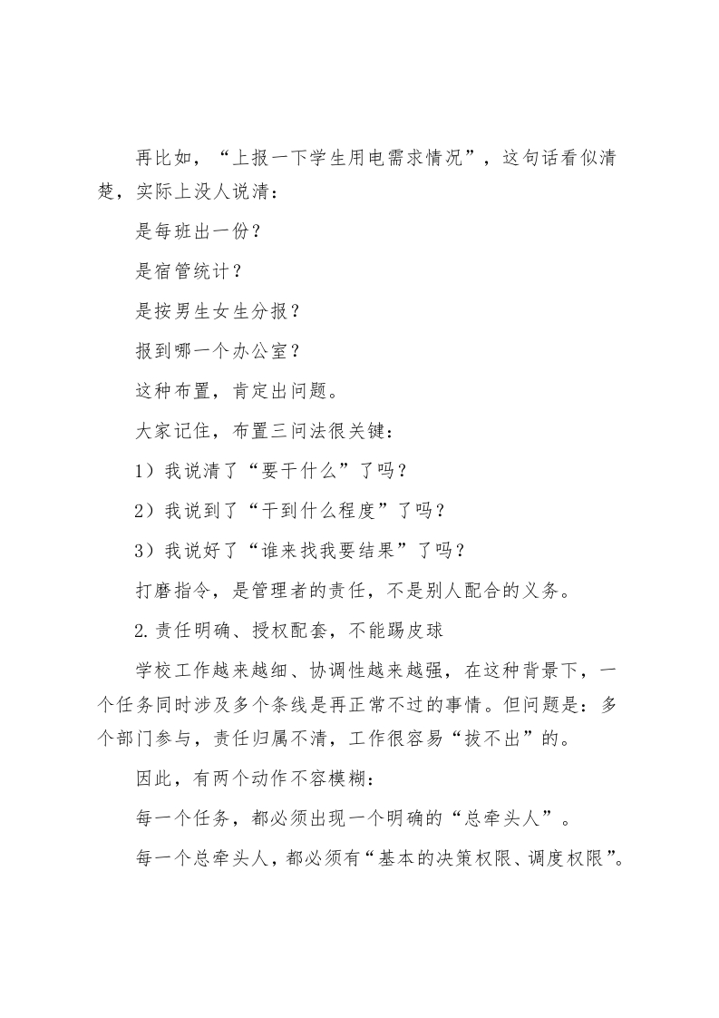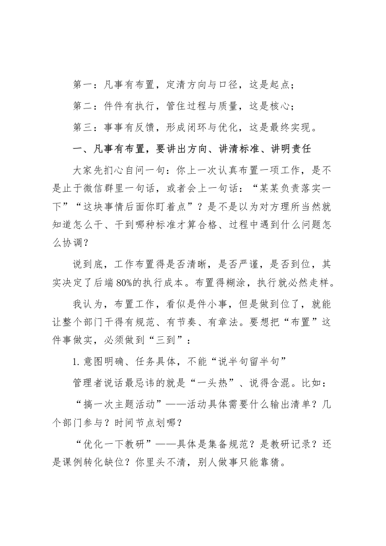 校长在行政班子会上讲话:管理“三有”不能缺:凡事有布置,件件有执行,事事有反馈各位班子成员、各位同仁:大家上午好!今天我们召开行政班子会,该讲的过程性工作就不一一展开,会议的核心,只有一件事我们要摁住一个老看见、老说起、但依旧棘手的“老毛病”,也就是:我们布置的工作,为什么总有一部分浮在表面、落不下去,甚至前紧后松、最后不了了之?有些事情,我们明明在会上说得清清楚楚,会议纪要和群里通知也发了,但等到节点临近再回头检查,总有人说:“之前不知道标准那么细”“这个环节以为谁谁执行了”“老张前段时间请假,这个事耽误了”。这些话,听着不是推卸,但一定说明一个事实:我们的管理链条掉了节、松了扣。一个高效的行政团队,不只是统一思想、部署任务,更是能“跟踪过程、闭合反馈、拿出结果”。不是我们布置的多任务不行,而是“管理闭环”这三个字在执行层面,还没有内化为每一位管理干部的行为习惯和管事风格。所以今天,我就讲三个部分,也可以理解为我们要落实的三个关键词: