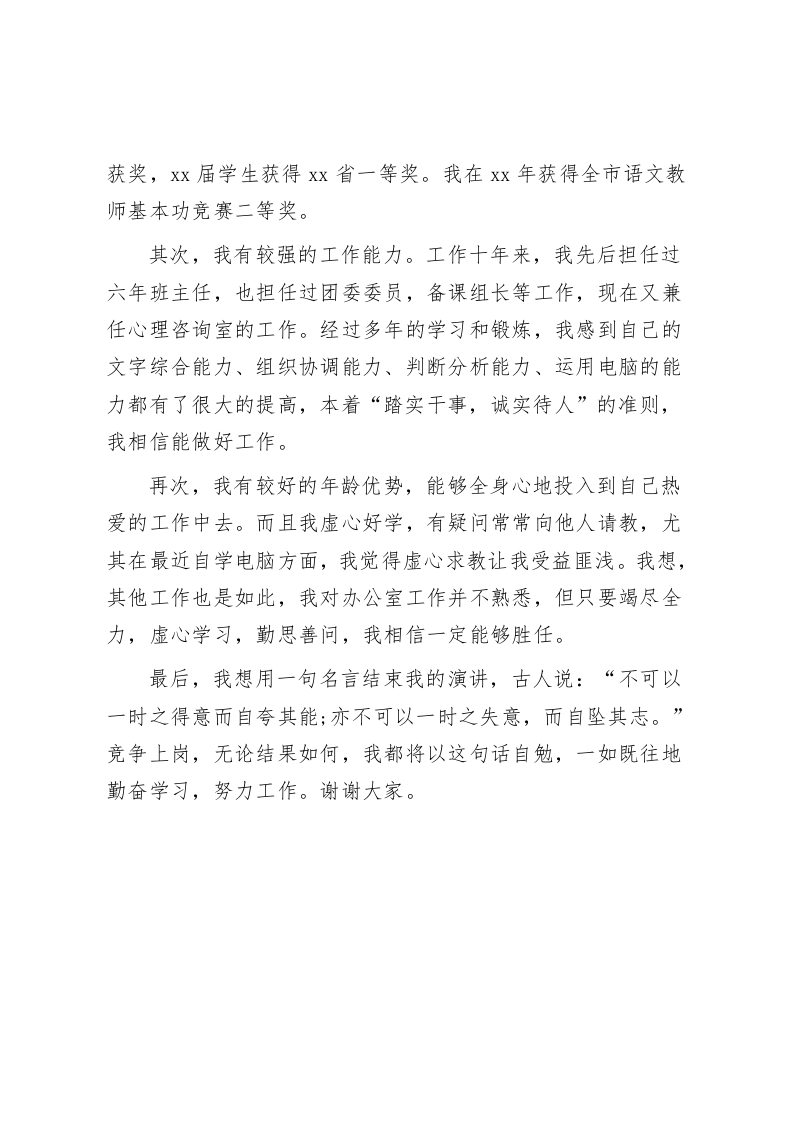 学校办公室主任竞聘演讲无论结果如何,我都将一如既往地勤奋学习,努力工作各位领导、各位老师:首先我感谢大家给我这个机会参加竞职演讲,我现年xx岁,xx年本科毕业分配进xx一中任教至今。我竞聘的岗位是校长办公室主任,理由有以下三点:第一、我认为这有利于提高自己的综合素质,全面发展自己,从而更好的为学校服务。据一家杂志社对上万名竞争新岗位人员进行的调查发现,有超过半数的人的竞职目的是为了提高待遇,有30%左右的人是为了发挥自身的能力,我就属于这30%。我在大学期间一直担任团总支书记,负责全系的团工作;工作十年来,有六年担任班主任;现在又参加了“心理咨询”研究生课程班的学习,从事学校心理咨询工作。每一次工作的变化,对我人生阅历的增长和能力的培养都是一次难得的机遇。我觉得新的工作环境能够学到新知识,增长新才于,开拓新视野,挖掘新潜力。挑战和机遇同在,压力与动力并存,我竞争新的岗位,目的就在于锻炼自己,获取多方面的实践经验,提高自身的综合素质,更好地贡献力量。