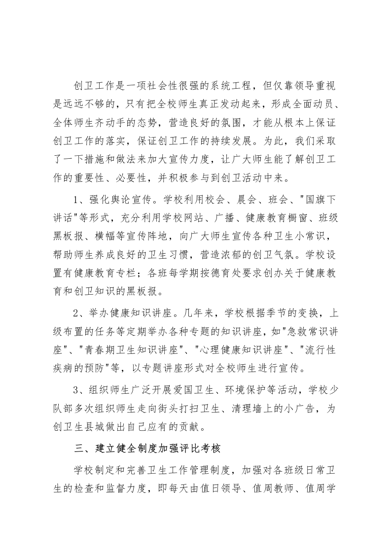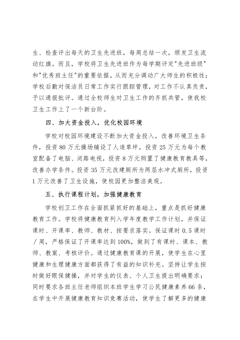 学校创卫教育工作开展情况汇报xx小学是一所村办小学,学校占地面积xx平方米,建筑面积xx平方米,绿化面积Xx平方米。现有教学班Xx个,学生Xx人,教师xx人,合格学历100%,大专以上学历95%,本科学历占61%,小学高级教师20人、县级名牌教师6人、市级教学能手6人。我校在各级政府和教体局的正确指导下,我们创卫从组织机构、资料收集到校园卫生管理,从卫生知识宣传、到健康教育的教学管理,从学生的日常行为到校园环境,经过全校师生的共同努力,我校的创卫工作已初见成效。现将我校几年来创卫情况简单汇报如下:一、加强领导管理,责任明确到人我们学校高度重视创卫工作,学校成立了以校长为组长,以主管副校长为副组长的创卫工作领导小组,实行校长亲自抓,各负责人分头抓,全体成员一齐抓的管理模式,实行环境卫生、健康教育、病媒生物防制工作的分块负责制度,明确各自的工作职责:确定由德育处负责全校创卫工作的日常事务,教务处负责对学生的健康教育。校办负责校园环境建设,后勤处负责学校卫生设施的改善。同时,将创卫任务层层分解,责任到人。二、加大宣传力度营造良好氛围