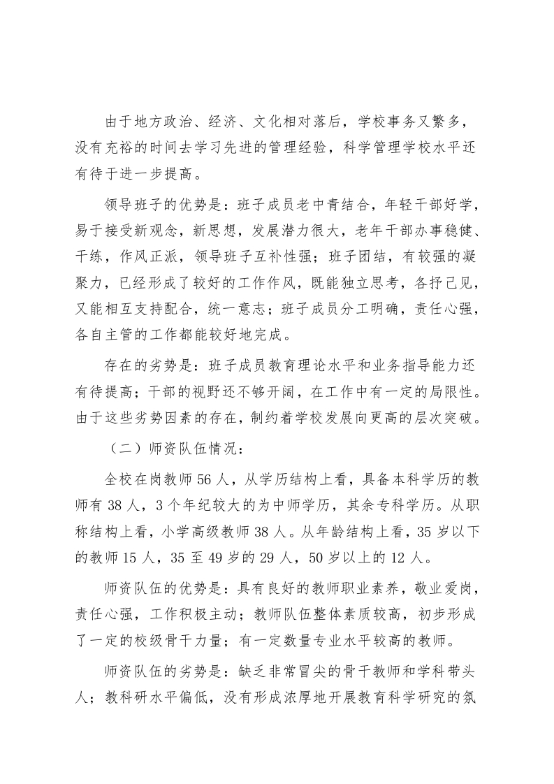 学校发展自我诊断报告培养个性化学生,努力建设一所高质量、有特色、现代化的学校一、学校发展自我诊断的目的与过程发展是学校的根本问题,一所学校没有发展就不能满足日益增长的教育需求,就不能在激烈的竞争环境中生存下去。为了更好地推动促进学校发展,就要深入学校,与各利益群体沟通,多方面收集信息,综合分析学校发展的现状、可利用的资源、面临的主要问题、多方利益相关者对学校发展的期待和需求等,从而找准学校发展突破口,明确学校发展方向和目标。学校发展诊断就是这样一个分析、判断、明确发展思路的过程。因此,我校成立了学校发展自我诊断工作小组,研究制定了自我诊断工作实施方案,召开了班子会、教师会及全体师生大会,使全体教职员工明确了这次自我诊断工作的意义及目的。通过问卷调查、座谈、访谈等活泼多样的形式分别对干部、教师、学生、家长进行调查,在取得大量宝贵的第一手资料的基础上,再进行分析、判断,最终形成《学校发展自我诊断报告》。二、学校基本情况概述我校地处街镇中心,始建于二十世纪五十年代。历经“普九”、“改薄”、“创规”过程,她已经发展为室场比较足设施比较齐、环境幽雅舒适、育人氛围浓厚的一所有学生一千一百四十五人,教学班二十二个,教师五十六名中等规模的农村