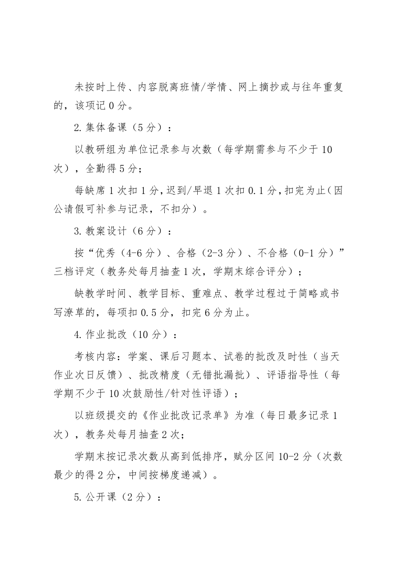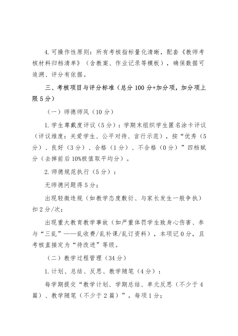 学校教师量化考核方案(2025年修订版)一、总则1.制定目的:科学评价教师教育教学工作实绩,激发教师专业发展内生动力,提升教育教学质量,保障学校“立德树人、质量为先”办学目标实现。2.适用范围:全校在职、在岗专任教师(含学科教师、德育教师)。3.考核周期:每学期1次,期末综合评定;过程性数据按月/按阶段收集。二、考核原则1.公平公正原则:考核标准、流程、结果全程公开(公示期不少于3个工作日),杜绝主观臆断与暗箱操作:建立考核异议申诉机制,保障教师知情权与申诉权。2.全面综合原则:涵盖师德师风、教学过程、教学质量、教科研、专业发展等维度,避免“唯分数论”,兼顾显性成果与隐性付出。3.动态发展原则:增设“起点提升率”“进步幅度”等指标,既评价当前成效,也关注教师成长变化,鼓励基础薄弱教师持续改进。