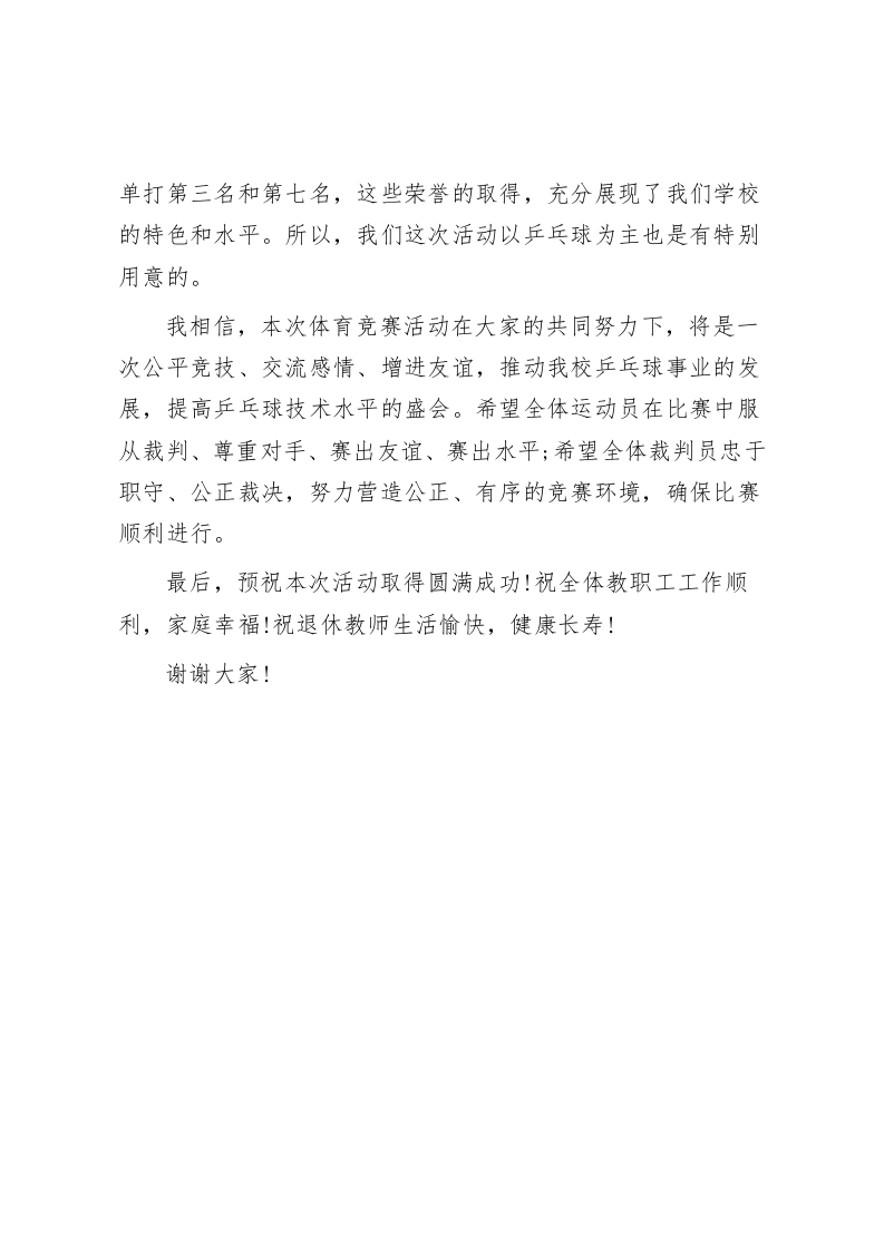 在工会组织的体育竞赛活动上,校长讲话活动的目的是让老师们在紧张的工作之余有所放松,以更加充沛的精力投入到教育教学工作中去尊敬的各位领导、各位老师:大家上午好!在大家热切的期盼中,今天我们欢聚一堂,正式拉开了体育竞赛活动的序幕。将参加今天竞赛活动的运动员有在职教师、代课教师、幼儿教师、安保人员、退休教师共30余人。这是近10多年来人员面最广,规模最大的一次体育盛会。今天我们在这里举办教职工体育竞赛活动,目的就是为了搭建一个教师强身健体、展示教育系统精神风貌的平台,调动大家参加体育健身活动的积极性,让老师们在紧张的工作之余有所放松,活跃文化生活,增进和交流感情,加强锻炼、增强体质,以更加充沛的精力投入到教育教学工作中去,共同推进教育事业再上新台阶。我们这次竞赛的项目是以乒乓球为主、棋牌为辅。乒乓球是国球,这项运动老少皆宜,人人喜欢,既可娱乐,又能健身。同时也是我们学校近几年来在“个十百千万”活动中创建的特色项目,并且非常成功,连续五年在县运会和片区运动会中取得了可喜的成绩,Xx年获县小运会男子团体第八名、女子单打第七名,Xx年获县小运会男子团体第七名,xx年获片区小运会女子团体第三名,xx年各级未举办,Xx年获县小运会女子单打第五名,xx年获县小运会团体第五名,女子
