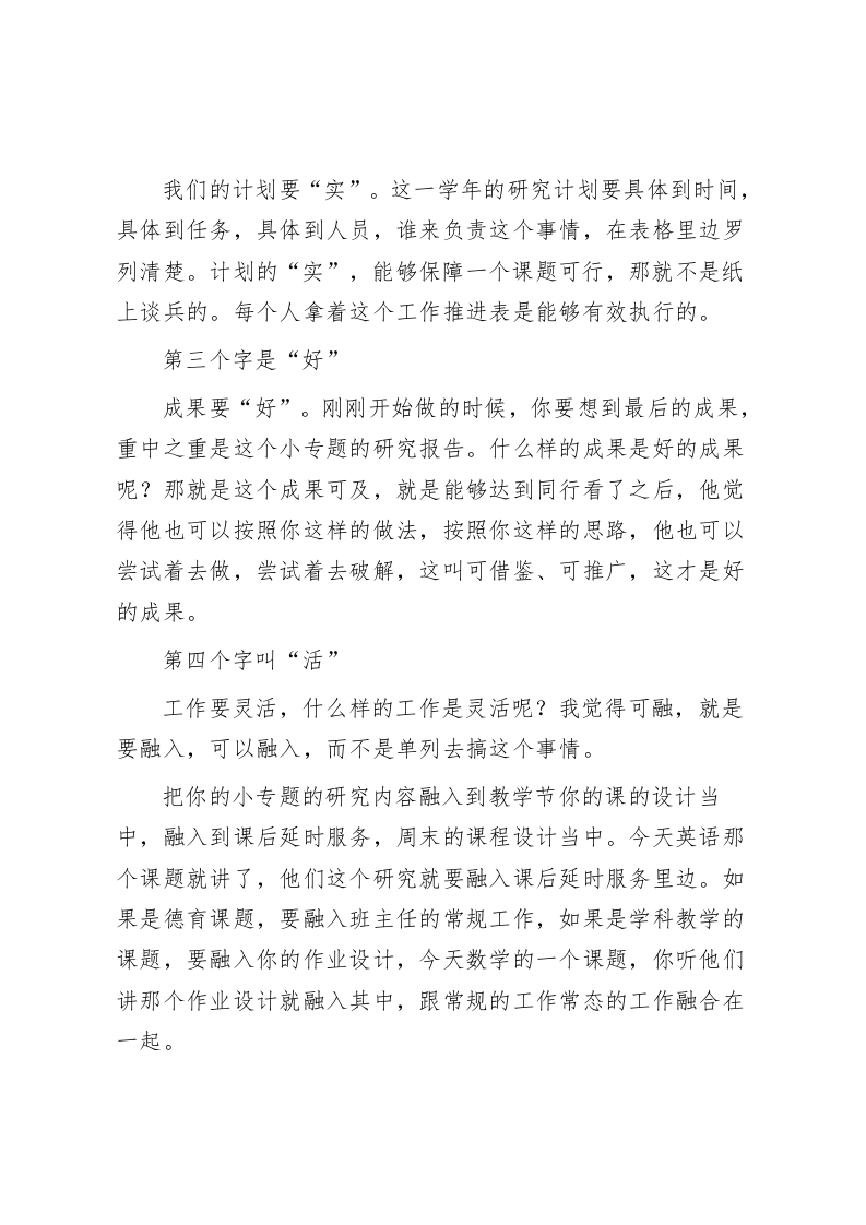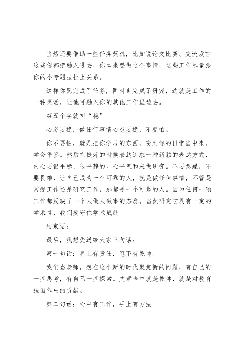 在教师科研工作例会上,校长讲话提了5个字,最后分享了3句话老师们:今天的会议非常重要,我在做教育科研管理的过程中,领导就说过这样一句话:“文章千古好,仕途一时荣。”文章就是把教育教学中的一些问题思考做法总结成经验性的文章,总结成可以推广的文章。这也就是教育科研。如何做好教育科研,我在讲完5个方面的要求后再和大家分享三个金句。我想给大家提五个要求,分别是五个字:第一个字是“新”这个“新”指的是问题要新。这项工作实际上我们在前期已经完成了申报。比如:“双减”、课后服务、幼小衔接、适应教育、五育融合、项目学习…这样一些提法,现在的热点问题就是新问题,就是我们教育行业内部需要探索的。一个“新”字,就决定了你这个课题可立,也就是立得住。所以往往一个好的问题基本上就决定了后面能不能产出成果。第二个字是“实”