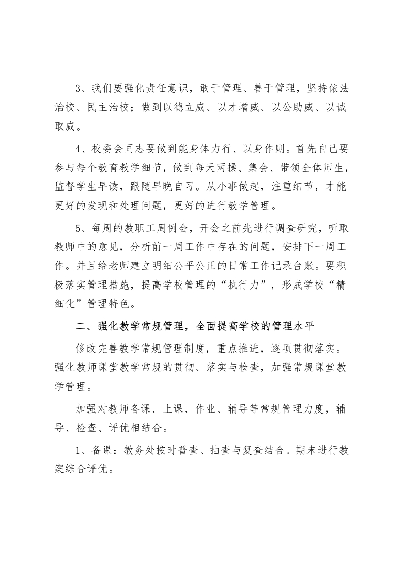 在教育教学质量研讨会上,校长工作经验交流发言教学质量才是教育的根本,我们一定要竭尽所能,发挥特长尊敬的各位领导、同仁们:大家好!下面谈一谈自己的看法,不妥之处,请领导和同仁们批评指正。一、加强学校管理,制度管人,从“领导者”变身“服务者”1、学校的日常教学工作和成绩,不是靠某一位领导或者老师学生就能取得成功,而是要靠全体师生的共同努力。作为校委会的同志,更要明白和理解自身的定位与角色,不能将自己当做高高在上的“领导”,而是要用十分的热诚服务、关心和热爱广大师生,实实在在解决老师和学生中存在的各种问题和困难,做到上下一心,团结一致。2、在学校,任何人不能凌驾于制度之上。制度是学校发展的根本和前提,制度的执行和坚守,也是当今人治与法制的一道分水岭,制度关键在于执行和落实。