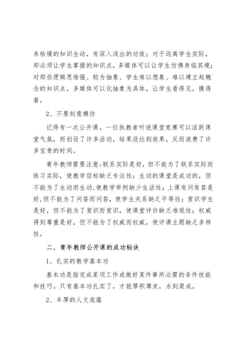 在青年教师课堂教学比武会上,校长点评发言,送给青年教师3点建议各位青年才俊:大家辛苦了!我看到我们青年教师会很注意结合自身特点,尤其是自己的薄弱环节,开展有针对性的技能技巧训练。我想经常性地开展公开教学活动,能使我们青年教师包括专业能力在内的多种能力都得到发展。那么,青年教师要上好公开课应该怎么做呢?以下几点想法与各位共勉。一、青年教师公开课要注意的几个问题自古有训,“刀不磨,要生锈”,“玉不琢,不成器”。如果一个青年教师不知道给自己充电,不会自我提升,那么要不了几年,这个教师也就没有竞争力了。所以,青年教师非常有必要参与公开课,不停地锻炼自己。青年教师上公开课应该注意以下几个注意的问题:1、不能为了多媒体而多媒体近几年,大家都有感受,就是上公开课需要有华丽的课件,要让学生充分感受多媒体的魅力。殊不知,学生们常为眼花缭乱的课件所陶醉,对重点知识却总记忆得少之又少。其实,公开课上多媒体不仅要用,还要用得“精”“当”“妙”。在解释基本知识原理的时候,多媒体的运用可以让本