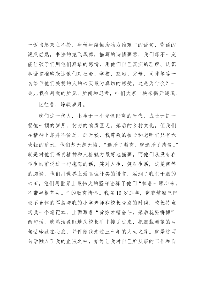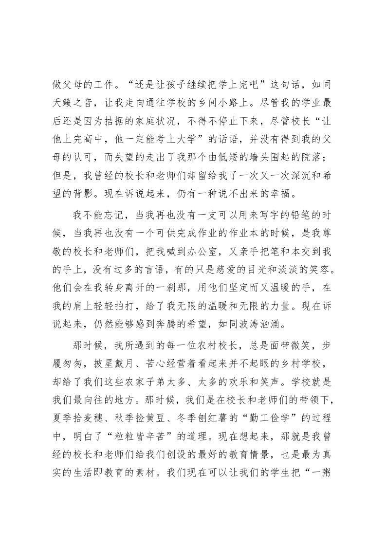 在全市农村学校校长培训班上,校长发言让农村教育绽放绚丽光芒尊敬的各位校长:大家好!首先对你们长年奋战在农村教育一线,并为之付出了艰难的劳动,表达我最真挚的敬意:对你们为实现自己的教育梦想,“不以物喜,不为己悲”,所取得不凡业绩的敬业精神,表达我最美好的礼赞。对此,在这里我深情地道一声一一我所尊敬的校长们,你们辛苦了。当然,我还要感谢领导给予我最大的信任。让我有了这次与大家交流的机会和平台。输入正能量,就是改造社会我之所以对在座的各位校长,表达我对你们肃然起敬的心情,是因为我曾经就是像你们一样朴实无华、谦谦做人的农村校长和老师们教育培养出来的。所以,我们时常怀着一颗感恩的心,追忆那段永久珍藏在记忆长河中的少年时代和生活并不富足的青春岁月。我无法忘记,从小学到初中再到高中,当穷困潦倒的生活,迫使我的学业无以为继的时候,是一任又一任,一茬又一茬的校长和老师们拖着疲惫的身躯,坐在我家的堂屋,不厌其烦去