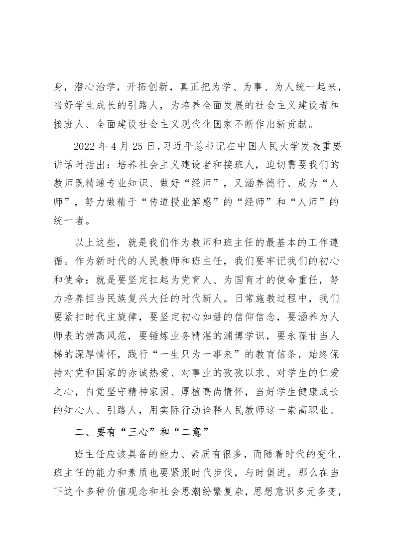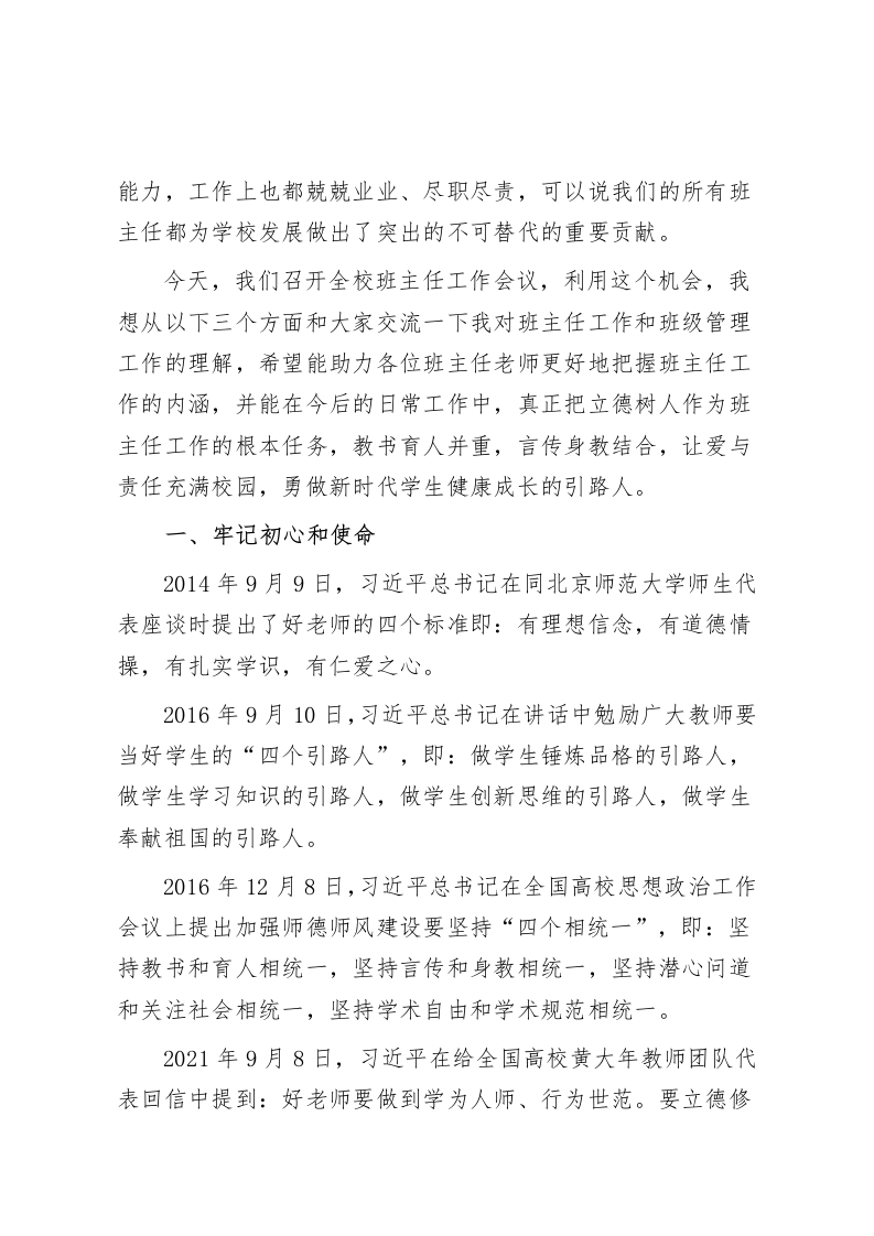 在全校班主任工作会议上,校长讲话守护良心做新时代学生健康成长的引路人各位班主任老师:今天有幸和各位班主任交流工作,我非常高兴。自工作以来,特别是负责学校管理工作的这些年,和同事在一起交流,经常会讨论起学校中哪个岗位最重要的问题,而我的答案是明确的,我认为学校各个岗位中,班主任这个岗位是最重要的。我认为班主任的工作就是“守护良心”,班主任是班集体的组织者和教育者;班主任是学生全面发展的指导者;班主任是联系班级中各任课教师的纽带;班主任是沟通学校、家庭与社会的桥梁;班主任是学校实施教学、教育工作的得力助手和骨干力量。学校是由一个个的班级组成的,只要班主任把各自的班级管理好了,学校的管理自然也就好了。班主任是一个班级的灵魂,班主任的思路和境界直接影响着班级的发展水平,也影响着学校的整体发展状况。“一个好班主任就是一个好班级”与“一个好校长就是一所好学校”是一个道理。班级形成什么样的风气、文化、精神,班级学生发展到什么程度,都取决于班主任的思想境界和思路。我认为我们学校的绝大多数班主任老师素质都非常过硬,具有较高的格局和境界,都有很强的管理