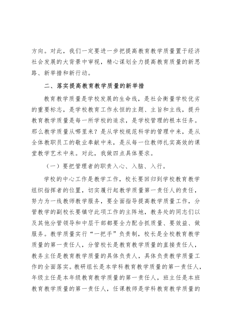 在全校教学教研工作推进会上,校长讲话通过科研引领寻求教学质量提高的新路径老师们:今天我们在这里召开全校教学教研工作推进会,会议的主要任务是:全面总结一学年来全校教育人致力于提高教育教学质量而奋力工作的实践与成果,并认真分析工作中存在的不足,以期今后一段时间我们把工作的经历、工作的关注点、工作的主攻方向聚焦到进一步促进教学质量提高上来,使我校教育教学质量再攀新高,再创佳绩。会议结束后请各年级组、教研组对照本年级、教研组的实际分析比较,扬长避短,查找教学质量提质增效方面存在的问题,通过科研引领寻求教学质量提高的新路径。请大家高度重视,将各项计划落地、落实、落细。下面,我讲三点意见:一、重视提高教育教学质量的新要求近年来,随着学校办学条件的明显改善,抓质量更加注重软件建设和内涵发展,这对整个教育体系、师资队伍、课程改革、教学方法都提出了更高的要求。努力提高教育教学质量已成为我校教育发展的核心主题,也是今后一个时期教育发展的重点。对学生的要求是主动学、都学好,对教育的要求是上好学、学得好。我们正在迎来教育教学质量的新时代,提升教育教学质量已成为教育发展必然的目标凝聚,是教育工作的主攻