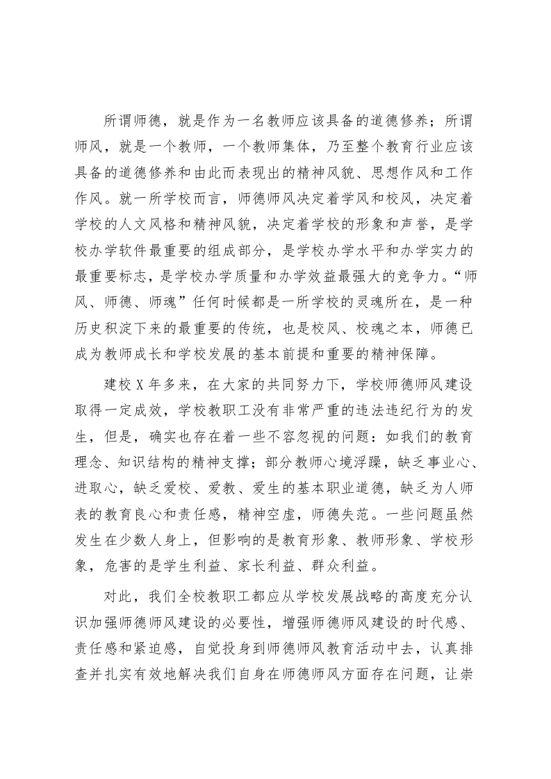 在师德师风教育活动动员会上,校长讲话希望大家不要疲倦消极,不要应付敷衍,更不要抵触,而要积极面对,认真对待各位老师:为了进一步加强我校教师职业道德建设,全面提升教师队伍素质,今天,我们在这里隆重举行假期师德师风教育活动,目的就在于动员全校教职工树师德、立师表、铸师魂、强师能、正师风,以饱满的工作热情和一流的工作业绩,推动学校又好又快发展。各位老师,我们现在的工作的确太多,诸如双减、五项管理、防溺水、新冠疫苗接种、疫情防控等等,但我们要学会十个手指弹钢琴,要明白,我们工作的根本还是师德师风问题,只有把握了这个根本,其它一切工作都会迎刃而解。因此,今天我们开这个动员会,希望大家不要疲倦消极,不要应付敷衍,更不要抵触,而要积极面对,认真对待。下面我讲几点意见,给大家加加油,打打气,进一步推动师德师风工作继续向前。一、充分认识加强师德建设的重要意义,不断增强投身师德教育建设的自觉性。(一)加强师德师风建设是改善师风学风校风,创人民满意学校的迫切需要。