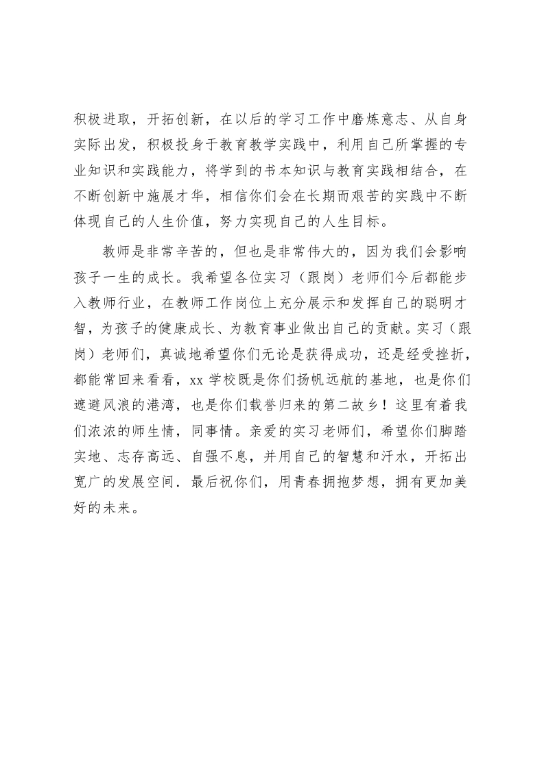 在实习(跟岗)老师会议上,校长讲话相信你们会在长期而艰苦的实践中不断体现自己的人生价值,努力实现自己的人生目标实习(跟岗)老师们:大家好!两个月的跟岗实习即将结束了,回忆昨天,你们奋进拼搏的身影,遍布学校的每个角落:晨曦夕阳映照的校园里,流下你们忙忙碌碌的足迹,在办公室里,记录着你们专心致志备课的身姿和跟学生谈话的浓浓深情:活跃的课堂,展示着你们的激情与才华。校园内留下了你们辛勤的汗水与感动的场面。你们认真扎实,刻苦钻研业务知识;你们勤勉敬业,虚心向指导教师请教,将先进的教学与管理理念注入了学校的课堂。在指导老师和学校领导的带领下,你们团结上进,才华与信心同在,激情与活力并存,你们在学校的表现,你们对学校的贡献,我们看在眼里,感动在心里,在此,我衷心地道一声:你们辛苦了,谢谢你们!今天,你们即将挥手告别,实习(跟岗)结束了,刚刚尝到了人生短途的酸甜苦辣,享受了成长成功的快乐,你们又将带着满怀的理想和无限的憧憬,用青春和才智去谱写人生又曲华彩乐章。作为校长,我很希望跟你们说几句心里话。希望你们胸怀远大理想,今后不管从事何种职业,都要艰苦创业,