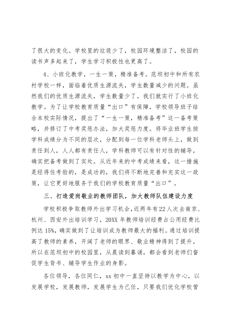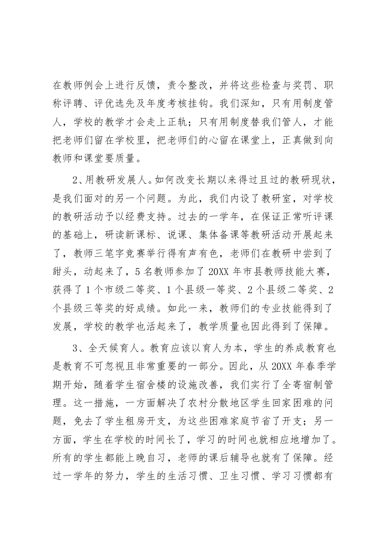 在校长论坛上演讲办好家长满意的寄宿制学校尊敬的各位领导、各位同仁:大家好!今天能在大会上发言,是大家对xx初中工作的认同,更是我的荣幸。我今天发言的主题是《全封闭寄宿全天候育人办好家长满意的寄宿制学校》,不当之处,敬请批评指正。一、不断改善办学条件,进一步完善基础设施近两年,在教育局的大力支持下,我们新建两个化粪池疏通了学生宿舍楼和教师宿舍楼的厕所,解决了师生上厕所远,不方便的问题;完成了对学校食堂的改造,解决了学生就餐餐位不足问题;学校水源不稳定,我们联系镇政府,解决了全校师生饮水困难的问题;对学生宿舍楼和教师宿舍楼的改造解决了师生的住宿问题。这些基础设施的改善,实现了全校学生全封闭寄宿,为全天候育人打下了坚实基础。二、加强制度建设,常规管理提质量1、用制度管住人。针对个别教师上完课就不见了踪影,部分教师心思没在课堂上,备课不充分,工作积极性不高。针对这些问题,我们对学校的各类制度进行了修改和完善。加强了对教师备课和批改作业情况的检查,及时找出问题,每月月底