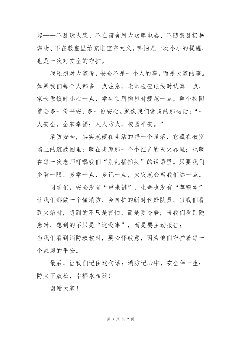 “11·9全国消防日”学生讲话稿—红领巾学消防,平安伴我成长尊敬的老师、亲爱的同学们:大家上午好!我是X×班的×××。今天我发言的主题是一一“红领巾学消防,平安伴我行”。同学们,你有没有想过,一根小小的火柴、一根没拔插头的电线、一张被太阳晒着的放大镜,都有可能引起一场大火。火,能给我们带来光和温暖,但它也可能带来危险和灾难。就像老师说的那样火可以点亮生活,也可能烧掉幸福。我还记得上学期看过一个消防安全视频,里面有一位叔叔为了救别人被浓烟呛伤,还有一位小朋友因为躲进柜子里没及时逃生而受伤。我看完之后,心里特别难过,也在想一一如果那天火灾发生在我们学校,我能不能做到冷静、勇敢、正确地逃生?后来我们进行了消防演练,我学会了许多有用的方法:听到警报要立刻行动;逃生时要弯腰、掩鼻,靠右行走;不能推挤、不能回头;还要记住一一“119”是火警电话,是和生命赛跑的号码!每次演练时,我都告诉自己:这不是在“玩游戏”,这是在“练本领”。因为只有平时多练几次,真的遇到危险时才不会害怕。消防叔叔说过一句话让我特别难忘:“最好的灭火方法,就是不让火出现。”所以我们要从身边的小事做第1页共2页