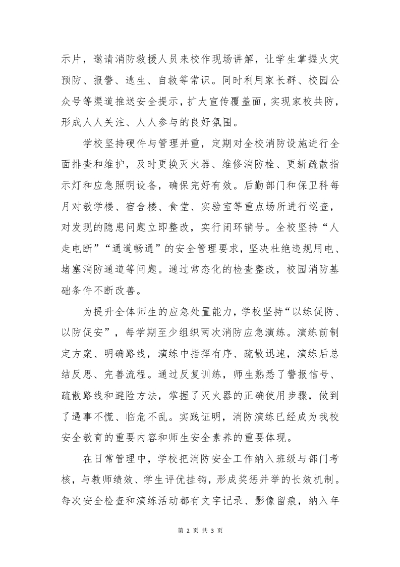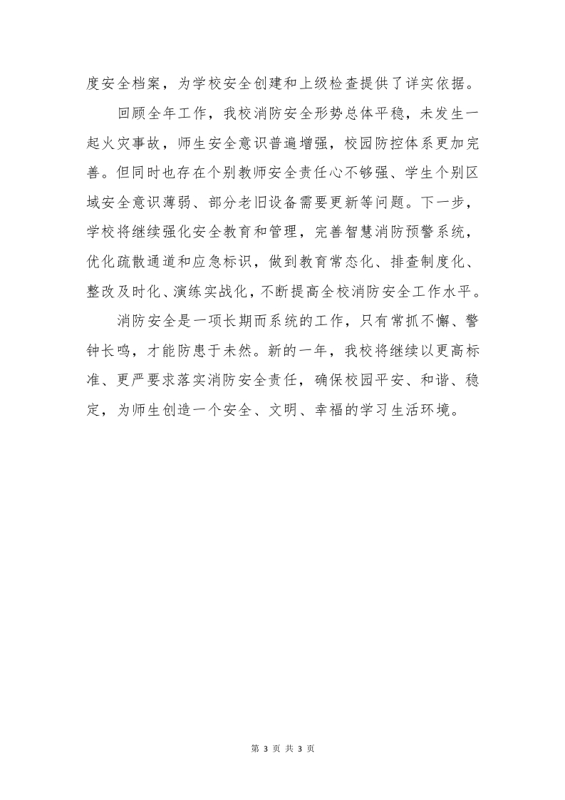 2025年学校消防工作总结—红领巾学消防,平安伴我成长我校始终把消防安全工作作为校园安全管理的重中之重,坚持“安全第一、预防为主、防消结合”的方针,认真贯彻落实上级教育主管部门关于消防安全的部署要求。学校坚持以制度建设为抓手,以宣传教育为载体,以隐患排查为重点,以演练实践为途径,进一步健全机制、压实责任、完善设施、强化意识,全力保障广大师生的生命财产安全,现将全年消防安全工作总结如下:今年年初,学校及时调整成立了消防安全工作领导小组,由校长担任组长,分管副校长任副组长,教导处、政教处、总务处、保卫科及年级组长为成员,层层明确职责,细化管理任务,形成了“主要领导亲自抓、分管领导具体抓、处室人员协同抓、班主任落实抓”的工作格局。各级人员签订了消防安全责任书,做到职责到人、责任到岗。学校还制定完善了《消防安全管理制度》《消防设施检查制度》和《消防隐患整改制度》,做到有章可循、有制可依。在消防宣传教育方面,学校始终坚持将消防安全纳入日常教育教学内容,通过国旗下讲话、主题班会、安全教育课、黑板报和校园广播等多种形式,持续开展消防安全宣传。每年“119消防宣传日”期间,学校开展“红领巾学消防”“识火懂险,自护先行”等系列活动,组织学生观看消防安全警第1页共3页