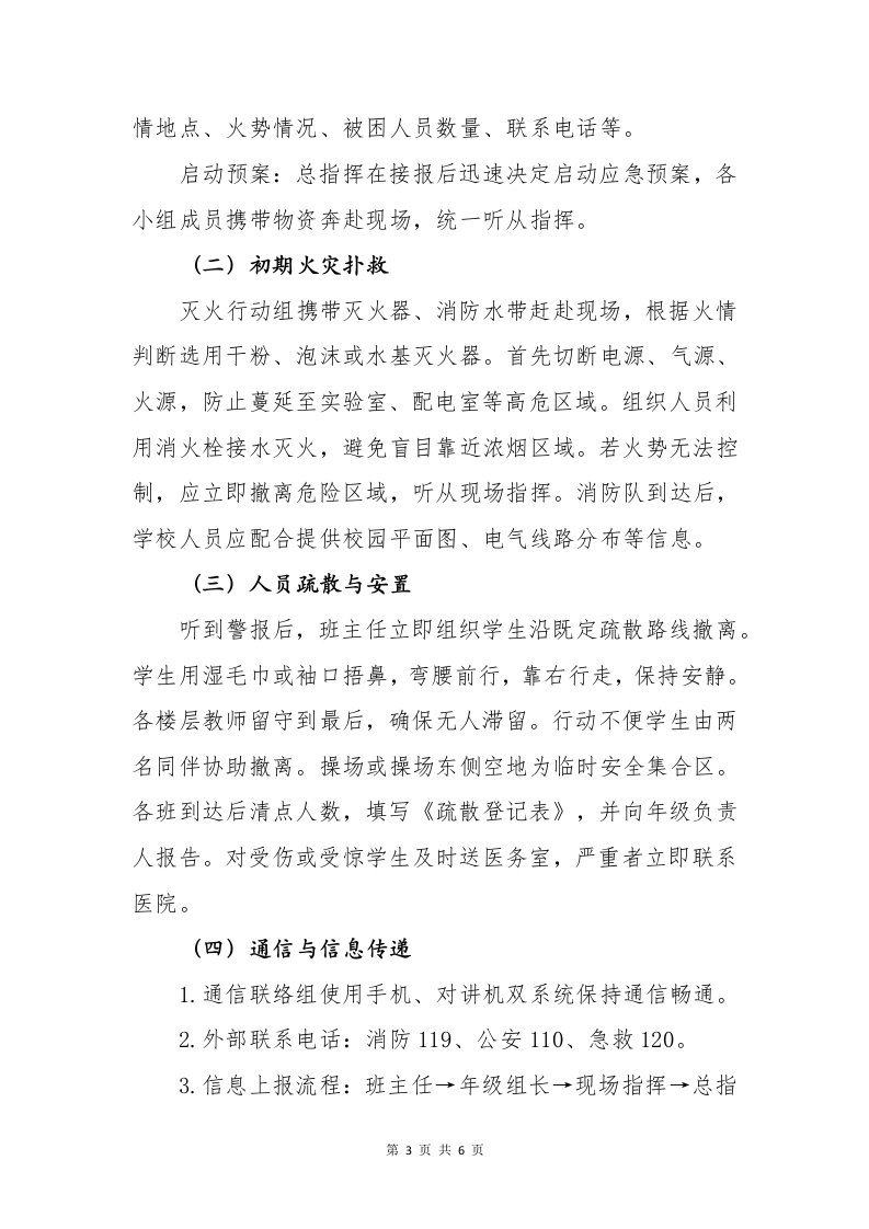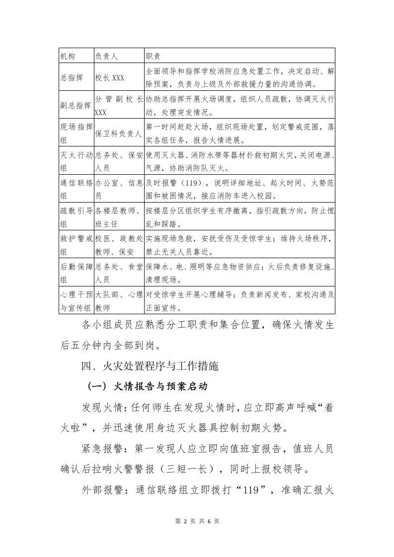 2025年学校消防应急处置预案一红领巾学消防,平安伴我成长一、编制目的为进一步健全和完善学校消防安全管理制度,切实提高学校预防和处置火灾事故的能力,最大限度地减少人员伤亡和财产损失,确保广大师生生命安全和校园财产安全,根据《中华人民共和国消防法》《中小学幼儿园安全管理办法》和《×市消防安全条例》等法律法规,结合我校实际,特制定本消防应急处置预案。本预案坚持“安全第一、预防为主、防消结合、以人为本”的原则,通过建立科学、系统、实用的应急机制,使师生熟悉应急程序,明确岗位职责,确保火灾发生后能做到反应迅速、指挥有序、处置有效、协同配合。二、适用范围本预案适用于全校范围内发生的各类火灾事故和火灾隐患应急处置工作,包括但不限于教学楼、实验室、图书馆、食堂、宿舍、办公楼、配电房、车棚、仓库等重点区域。同时,本预案也适用于学校组织的消防演练、消防宣传月活动和重大节庆期间的临时防火应急管理。三、组织体系与职责分工为确保学校在火灾发生时应急反应迅速、指挥有序,学校成立消防安全应急指挥部。第1页共6页