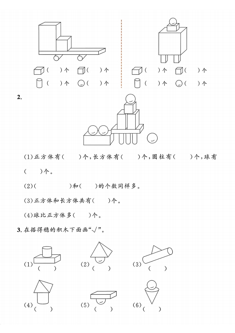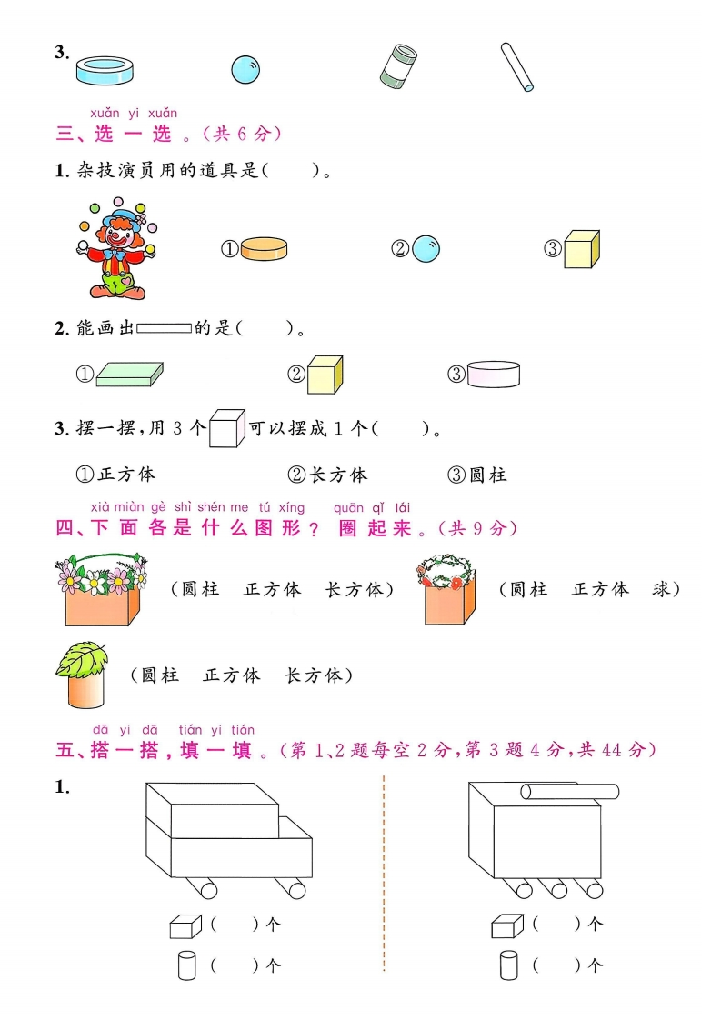 2025青岛63制一年级数学上册单元测试卷第三单元提优测试卷时间:40分钟总分:100分姓名:得分:shǔyishǔtian yi tian一、数一数,填一填。(共16分)器1.认真数,将表格填完整。(8分》0已皂长方体正方体圆柱球量)个)个)个)个2.填一填,画一画。(8分)(1)一共有()个图形。(2)个数最多的图形是()。(尝试写出它的名字)(3)可以四处滚动的图形有()个,在图形下面画“√/”。救ba mei yi hang zhong bu shi tong yi lei de quan chu lai二、把每一行中不是同一类的圈出来。(共12分)