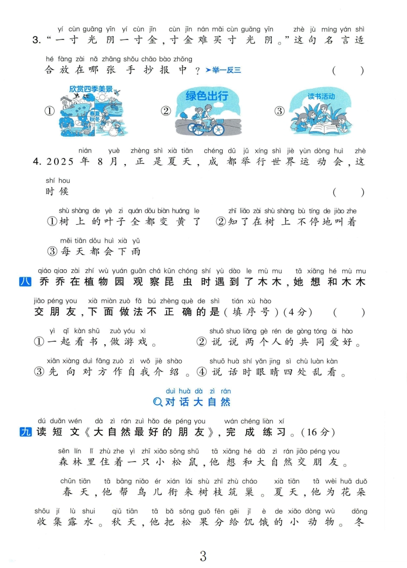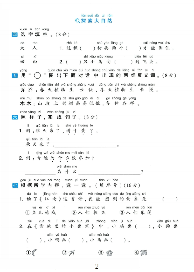 2025一年级语文上册第五单元测试卷第五单元测试卷霸时间:60分钟满分:100分xin shong si ji de mei jing rang wo men yi qi zou jin da zi ran he da zi ran jido peng you ba欣赏四季的美景,让我们一起走进大自然,和大自然交朋友吧!guan cha da zi ran0观察大自然密yònghua chu jia dian zi zheng que de du yin用画出加点字正确的读音。(4分)毁封duǒduo ju hua qiao giaokai lepiao lai:(y7yiy)朵朵菊花悄悄地(dide)开了,飘来一(yiyi线zhen zhen qing xiang zhe shi qiu tian song lai dejùju wen hou)阵阵清香,这是秋天送来的一(yiy)句句问候。du pin yinxiězici内日读拼音,写字词。(16分)dasikai不ziran zhen qi miaoyi nian yǒuchun lai bai hua自然真奇妙!一年有季春来百花要yezitiankěrenxiàdao zhi liao jicàogiu laihuangdongdui xueě答夏到知了叫,秋来黄冬以堆雪xiang yi xiangtian yi tian家题目想一想,填一填。(8分)jiang de pian pang shishùde pian pang shi1.“江”的偏旁是“树”的偏旁是nǚgongbdibi shikěyizǔci2.“女”共笔,第1笔是可以组词:0sigongbbi shiziyěyou zhe ge“四”共3.笔,第4笔是字也有这个bi hua笔画。1