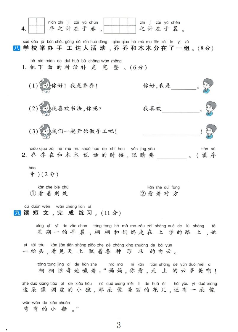 2025人教版一年级语文上册第五单元测试卷第五单元测试卷器时间:0分钟满分:100分yongei jia dian zi xuan ze zheng que de du yina用“√”给加点字选择正确的读音。(6分)yet拉wa密莲叶(Iidnnian)土地(dìde青蛙(qingginkai xinxiàogequn开心地笑(dide)封:个(Myi):群(y1yi)额du pin yinxiěcfyi日读拼音,写词语(16分)线zinǚxiǎoniaodongxkai guan内darensitiankěshi童zhúye不要tian yi tianxuan yi xuan目填一填,选一选。(8分)》答mǎgongbr必bi de ming cheng shi1.“马”共笔,第2笔的名称是(①shù家题tian xu haozhézhégou②héngzhéwan gou)(填序号)。X灯de dibr shiqiu zi de pian pang shi2.“西”的第5笔是,“秋”字的偏旁是br yi bi xuan yi xuan hua四比一比,选一选,画“V”。(8分)》yi pian pian yelezi cong shùshang luolexiàl6i☒1.一片片叶(了子)从树上落(了子)下来。di I you xisi ge yuan yuan de xigua2.地里有(西四)个圆圆的(西四)瓜。1