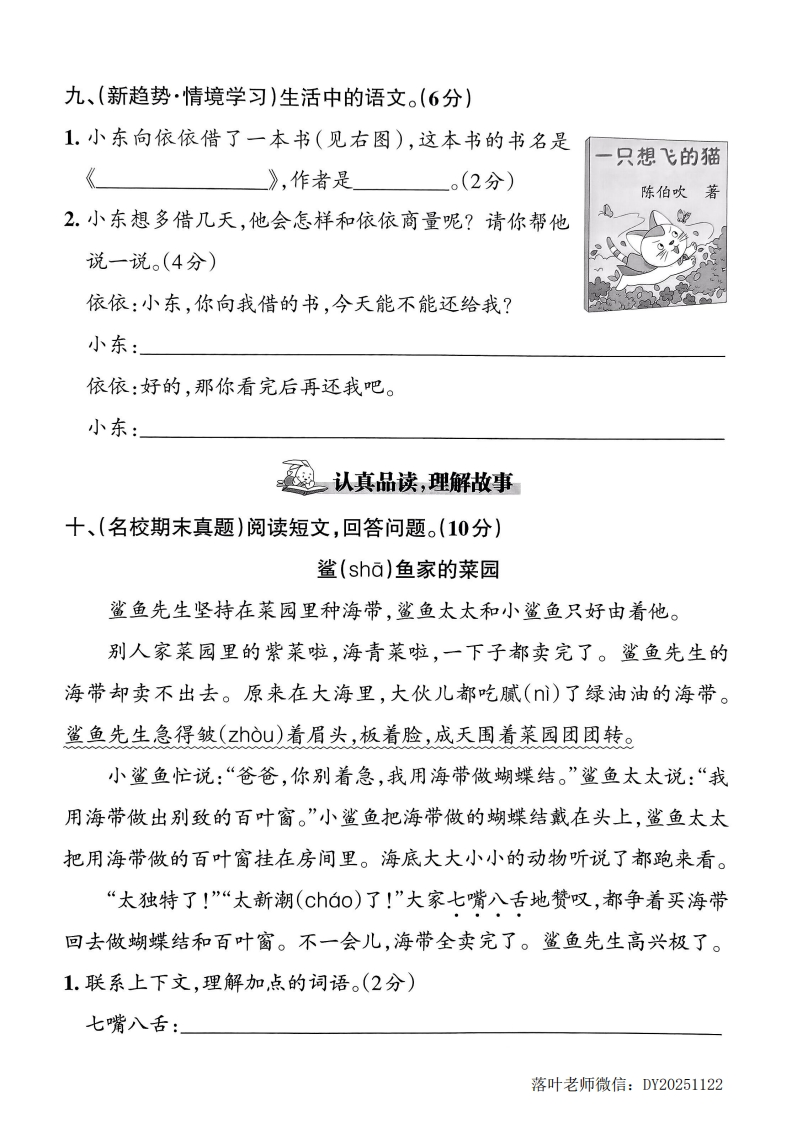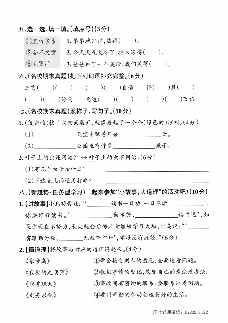 2025-2026学年二年级上册语文情境素养卷第五单元情境素养卷时间:40分钟满分:100分好的故事就像一颗灿烂的明珠,闪耀着智慧的光芒;它蕴含着深刻的孙弥道理,让人回味无穷。点滴积累,读懂故事一、用“V”为加点字选择正确的读音。(6分)1.救(jiùjiu)护车到达了赛(sàishi)场。2.当(dang dàng)狐狸发现自己上当(dangdang)时,已经太迟了。3.今天,寒号(háohào)鸟在崖缝外面做了一个记号(háohào),方便毁喜鹊过来找他。封二、看拼音,写词语。(20分)tian lianglindàhuazhòngdidizhidàohuidaguàixiǎngfhòu三、比一比,再组词。(8分)线观(抬(像(做(现(台(硒象(作(四、在括号内填上合适的词语。(6分)一()河一()杨树)的葫芦挤一()缝一()秋风()的天气落叶老师微信:DY20251122