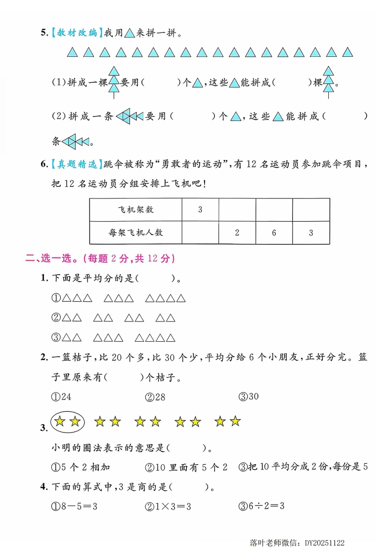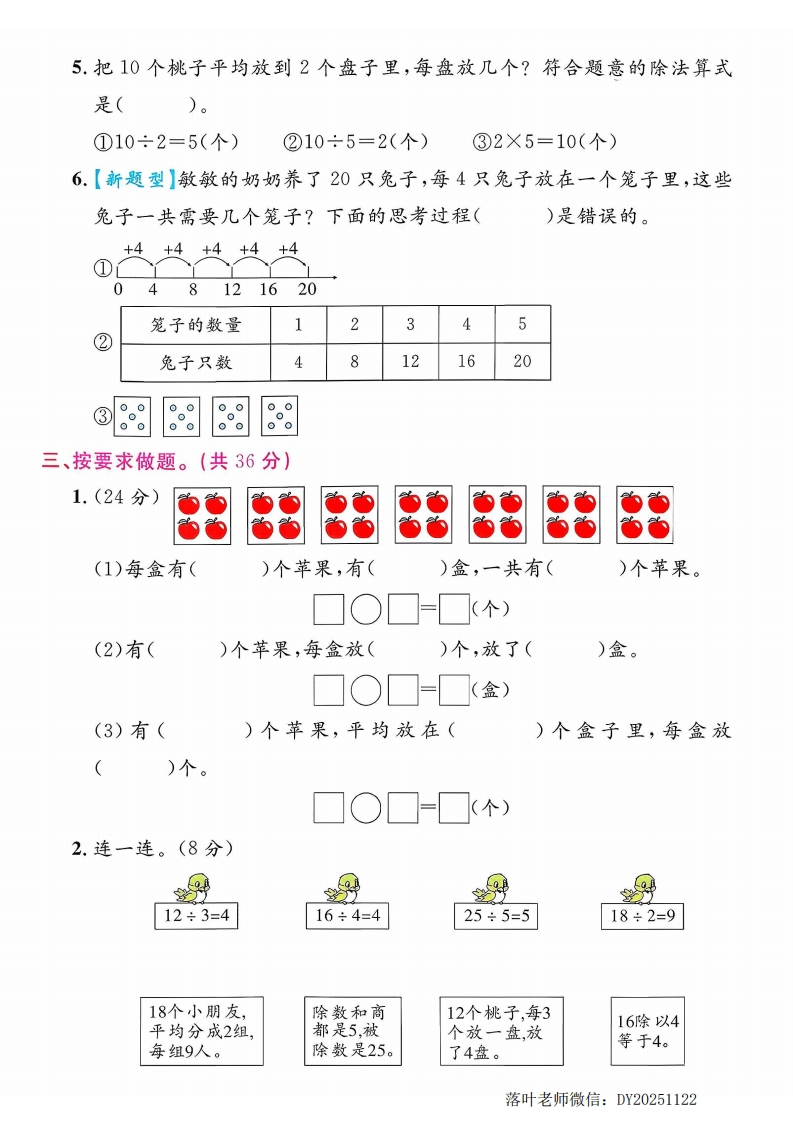 2025青岛63制二年级数学上册单元测试卷第四单元测试卷时间:40分钟总分:100分书写等级:质量等级:一、填一填。(每空1分,每个算式2分,共28分)1.下面是平均分的画“√”,不是平均分的画“X”。(2.(1)15个篮球,每()个一份,分成了()份。量☐÷☐=☐份)(2)15个篮球,平均分成了()份,每份()个。3.五年级二班24个同学在分组投篮。(1)每组6人,可以分成()组,列式计算为((2)每组8人,可以分成()组,列式计算为(40000000000000000(1)如果每个小朋友分4支,可以分给()个小朋友。□÷☐=☐个)(2)如果有8个小朋友,平均每个小朋友分()支。☐÷☐=☐支)落叶老师微信:DY20251122