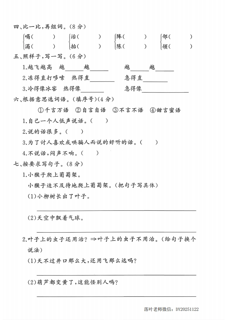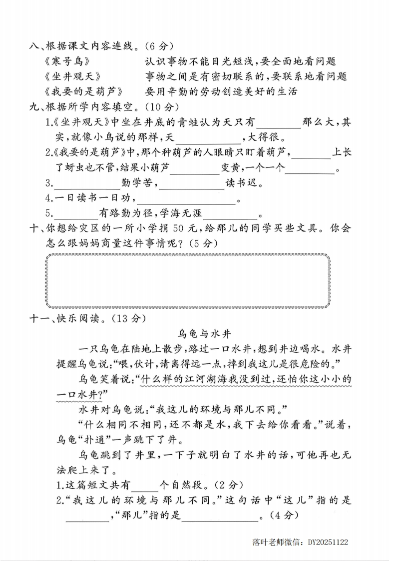 2025人教版二年级语文上册单元测试卷第五单元测试卷器检测时间:60分钟满分:100分题序二三⑧五六七八十一总分得分一、认一认,连一连。(7分)弥quannongkěquesaiguaman新封线T0T弄渴劝赛刮内二、给加点的字选择正确的读音,填在括号里。(4分)蕾坐o坐s业ses堂s管管笑坐学堂3不dangdanghàohao名ee4+643n345e99s99e9eses06909068要口号()号叫()上当(当然()三、读拼音,写字词。(14分)答我的inj张大爷是个qiguài的老家题头儿,明明领着退休金,却要出去捡废品。对此,大家都bùnéng理解。还是一封感谢xin让大家知道了dd案:原来张大爷一直在资助几个家庭困难的学生。从此yhou面对这位huà不多的老人,我产生了由衷栏的敬佩之情。落叶老师微信:DY20251122