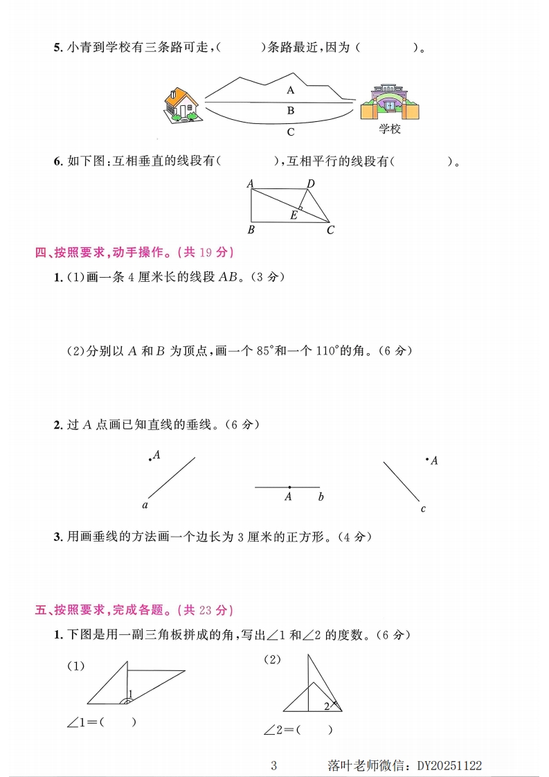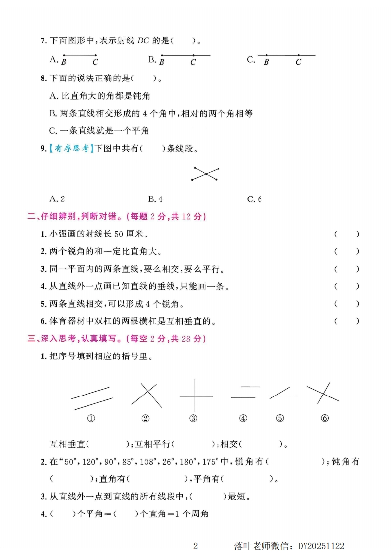 2025冀教版三年级数学上册单元测试卷第三单元测试卷时间:60分钟总分:100分+10分书写等级:得分:一、周密分析,谨慎选择。(每题2分,共18分】1.下面共有()条线段。孙A.3B.4C.52.下面关于线段、射线、直线的描述,错误的是()。A.线段能测量长度B.直线没有端点,射线有一个端点,线段有两个端点C.两条射线的长度等于一条直线的长度3.在一条直线上截取10厘米长的线段,可以截取()条。蜜A.10B.100C.无数4.画角时,量角器的零刻度线应当与()重合。A.角的顶点B.画好的射线C.画好的直线5.如下图,把它分成两个角,下面说法错误的是()。A.两个角可能都是锐角B.两个角都是直角救C.两个角可能是一个锐角和一个直角6.下图中,有()组互相平行的直线。SAA.1B.2C.31落叶老师微信:DY20251122