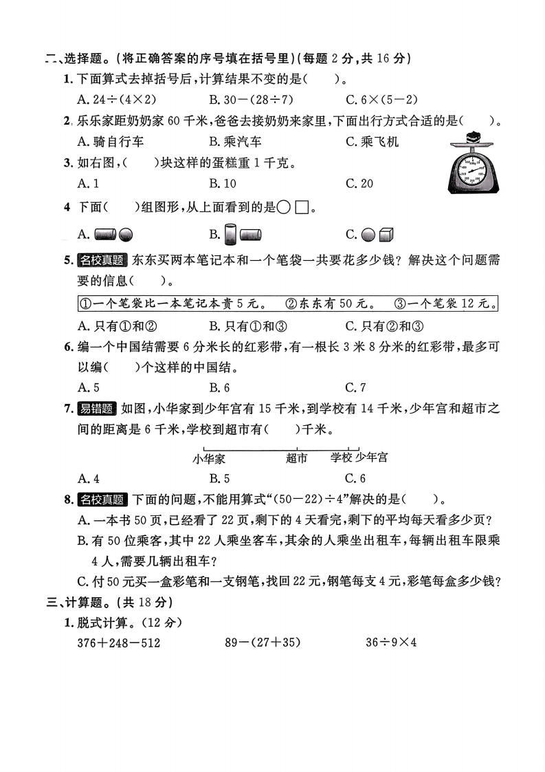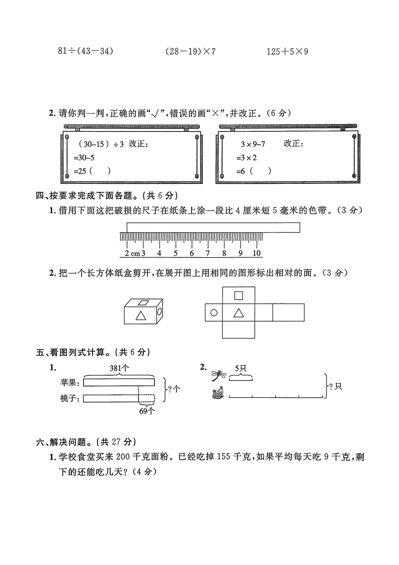 2025年人教版三年级数学上册期中测试卷繁期中测试卷一、填空题。(第2题4分,第4题3分,其余每空1分,共27分)】1.在()里填上合适的单位。小林体重约35()三角尺厚1(教室门高约20()一个柚子重约1500()一辆货车的载质量约4()飞机每小时飞行900(2.(1)被减数是65,减数是4和7的积,求差,列综合算式为((2)被除数是19和29的和,除数是8,求商,列综合算式为()。3.在()里填上合适的数。14厘米+26厘米=()分米2米一3分米=()分米3700米一700米=()千米2吨+十3000千克=()吨100克十1900克=()千克43厘米一150毫米=()毫米4.下面每组算式中,哪个算式的结果大?在后面的()里画“/”。63+18÷9(6X8-3()[45-9×3((63+18)÷9(6×(8-3)(45-9÷3()5.一个立体图形,从某个方向看到的图形是☐,这个立体图形可能是()。6.小夏把两个装有陶器的盒子摞在一起,你知道下面右边的三幅图分别是从哪个位置看到的吗?(填“前面”“右面”或“上面”)莽7.名校真题元宵节,东东一家五口人围坐在一起包汤圆,一共包了33个,如果每人吃8个,还要再包()个。8.商店进行促销活动,每买5瓶汽水赠送1瓶。现有30名学生,每人要喝1瓶汽水,最少要付()瓶汽水的钱。9.聪聪在班级的图书角阅读《趣味数学》时看到一道数学题:。×口十25=☆,已知当口=8时,☆=65,那么O=(),当口=9时,☆=()。