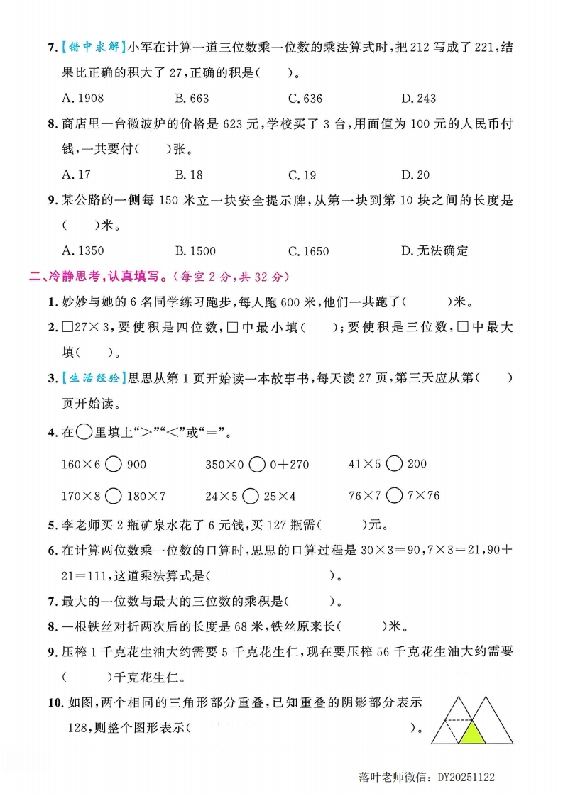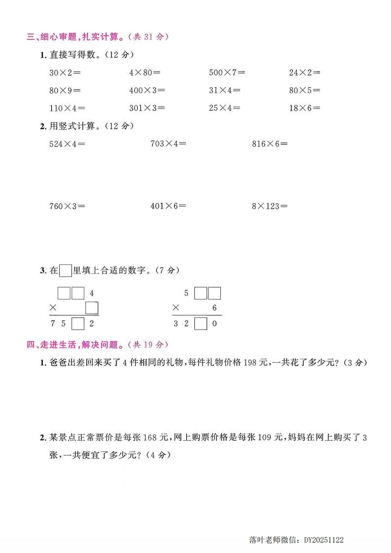 2025青岛63制三年级数学上册单元测试卷第五单元测试卷时间:60分钟总分:100分+10分书写等级:得分:一、周密分析,正确选择。(每题2分,共18分)1.【数形结合】妙妙在口算16×4时所用的方法是2×4=88×8=64,下面选项),能表示妙妙的想法。A巴巴巴田B.用D.出田2.爸爸乘飞机出差,飞机飞行了5小时,飞机最快每小时飞行860千米,最慢每小时飞行680千米,飞机可能飞行了()千米。A.4500B.4300C.3900D.33003.语文老师为三年级一班的43名学生每人买了一本8元的故事书,下面竖式中的蜜4X8表示()。A.买8本故事书需要多少元B.买4本故事书需要多少元43×8C.买43本故事书需要多少元D.买40本故事书需要多少元3444.植树节期间,我们学校有男生89人,女生分成了4组,每组35人,一起去参加植树义务劳动,我们学校一共去了()人。A.496B.229C.51D.1405.甲、乙两城的高速公路长800千米,爸爸开车从甲城到乙城,每小时行98千米,4小时后到达某服务区休息,服务区的可能位置是()处。恝①②③④乙A.①B.②C.③D.④6.【生活情境】学校的一条水泥路长108米,小军在水泥路上跑了4个来回,一共跑了()米。A.864B.648C.432D.216落叶老师微信:DY20251122