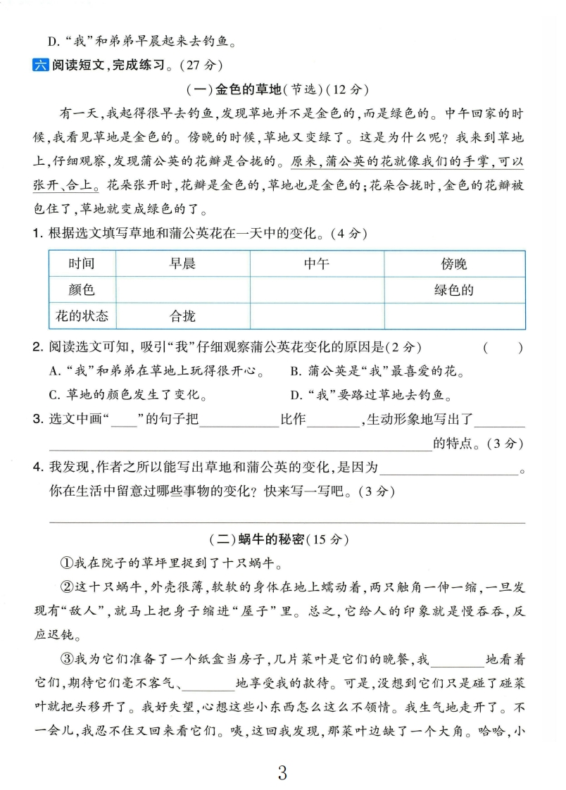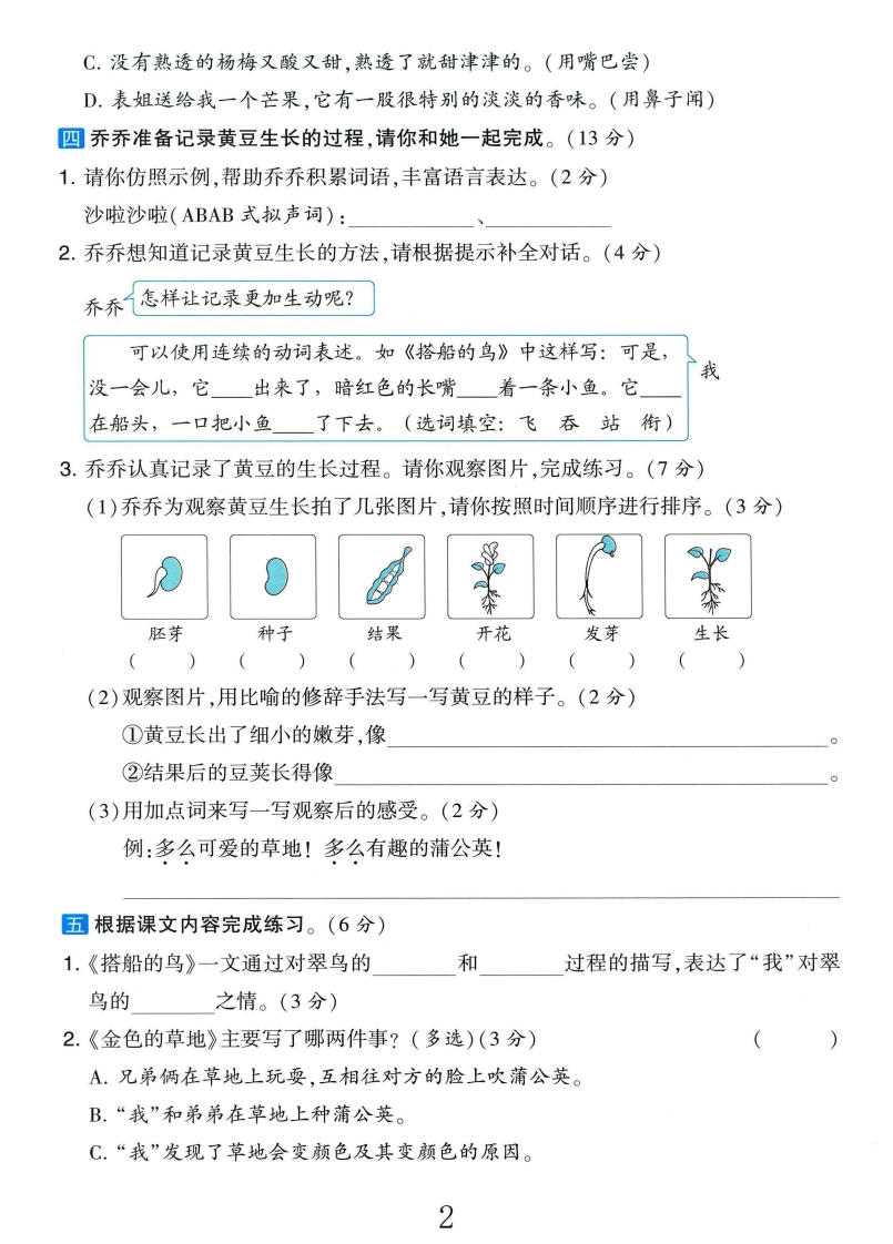 2025人教版三年级语文上册第五单元测试卷第五单元测试卷时间:90分钟满分:100分骤给加点字选择正确的读音,画“√”。(6分)》鹦鹉(yin ying)船舱(cdngchang)蒲公英(púpǔ))收拢(lǒngnǒng)衔来(xanxian)哗啦啦(1āla)密日看拼音,写字词。(10分)》1.他pi shang()外套,an jing()地坐到shādi()上,lian毁封(chao zhe)太阳升起的方向,打了个hāqian()2.他da()船过河,看到一只yǔmáo()五彩斑斓的鸟在船头wan shuǎ线()。他伸出手想要bǔ()捉,但鸟儿一下子飞走了。目选择题。(8分)内1.举-反三下列选项填人横线中正确的一项是(2分)(1)爷爷轻轻着扇子,望着天边的晚霞。敦不(2)沿着石子成的小路向前走,会看到一条两岸长满草的小溪。A.摇遥蒲铺B.遥摇铺蒲要C.摇遥铺蒲D.遥摇蒲铺2.下列句子中,加点字的意思与其他三项不同的一项是(2分)答A.吐鲁番盛产葡萄干。B.在寒冷的冬季,蜡梅花开得最旺盛。C.林中树木非常茂盛。D.路两旁都是高楼大厦,呈现一片繁盛的景象。荞题3.下列加点词语使用不正确的一项是(2分)A.河水静悄悄地在月光下流淌,闪动着粼粼的水光。B.大雪过后,山川、河流、树木都变成白茫茫的一片,美丽极了。C.弟弟,本正经地站在舞台中央,好像一名主持人。D.晚会上,同学们引人注目地看着表演。☒4.>举一反三下列句子对应的观察方法不正确的一项是(2分)时A.这只小鸟有一张暗红色的长嘴。(用手摸)》eB.天下着雨,雨点儿打在船篷上,沙啦沙啦地响。(用耳朵听)1