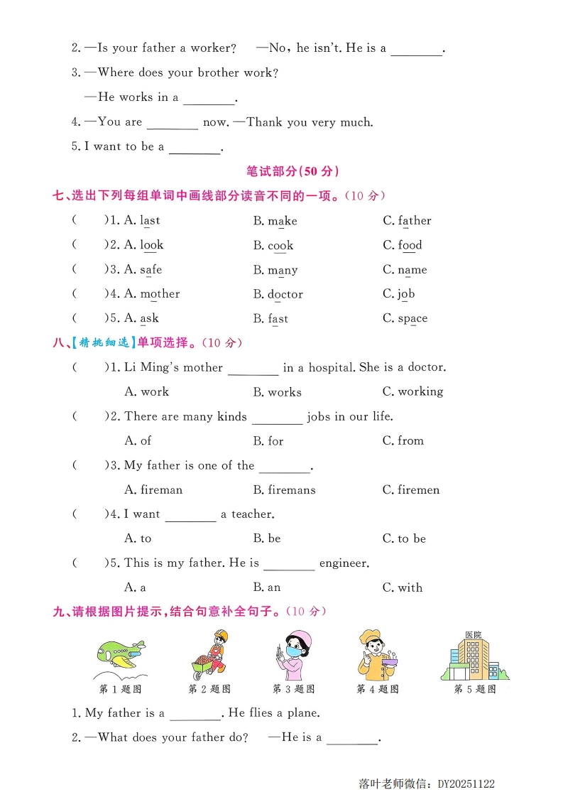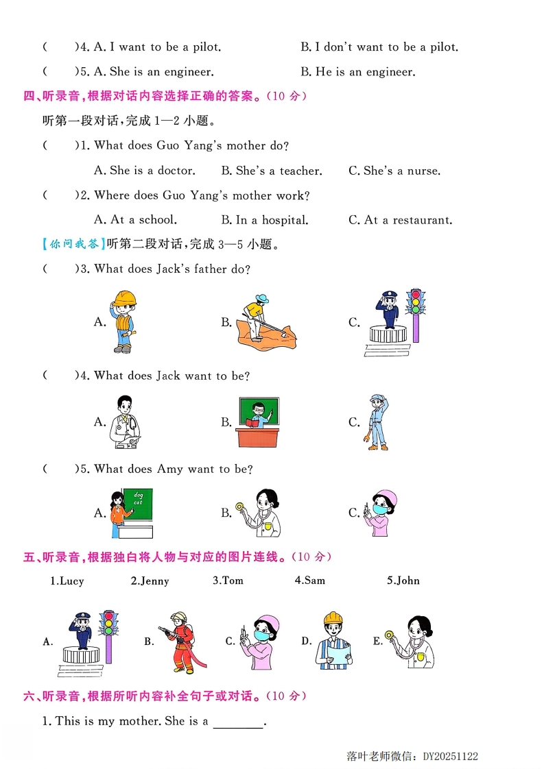 2025冀教版四年级英语上册单元测试卷Unit4综合素养过关卷时间:60分钟书写等级:质量等级:▣可听力部分(50分)】▣一、【辩真识假】听录音,判断下列图片与你所听内容是(T)否(F)相符。(5分)非nn可3图书馆(二、【图文相映】听录音,选出与你所听内容相符的图片。(5分))1.量)2.A.可学校甲甲田5)3.AB.)4.A毁dogcat)5.三、听录音,选出你听到的句子。(10分))1.A.A fireman calls out loudly.B.A fireman asks for help.)2.A.I'm proud of her.B.I'm proud of him.)3.A.What does your father do?B.What does your mother do?落叶老师微信:DY20251122