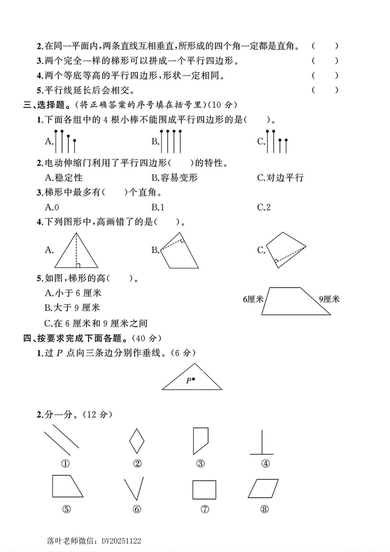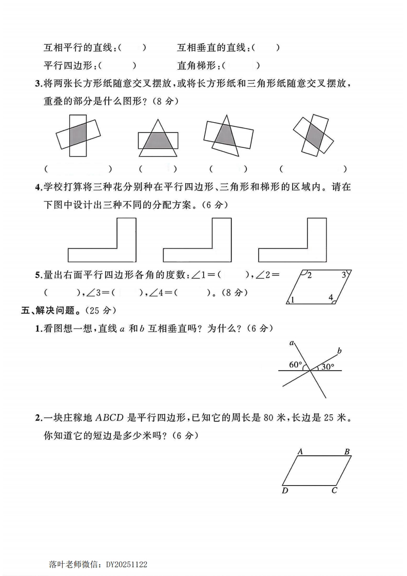 2025人教版四年级数学上册单元试卷第五单元测试卷时间:90分钟满分:100分+10分题序二三四五附加题总分鄂得分、填空题。(每空1分,共15分)药1.下面的各组直线,互相平行的有(),相交的有(),互相垂直的有()。(填序号)封荒线①②③2.下图中,(内)和()一样长。3量不3.()组对边分别平行的四边形叫作平行四边形;只有一组对边要()的四边形叫作梯形。()和()可以看成特殊的平行四边形。!4过直线外一点画已知直线的垂线,可以画()条。毁5.长方形的两组对边互相(),邻边互相()。题6.一个平行四边形一条边长6厘米,和它相邻的另一条边长4厘米。这个平行四边形的周长是()厘米。6cm7.如图,平行四边形中AD边上的高是()cm。.18cm8.一个梯形的下底是上底的3倍,如果将上底延长8厘米,就成为一个平行四边形。这个梯形的上底是()厘米。二、判断题。(对的画“√”,错的画“×”)(10分)1.只要把长方形的纸对折两次,形成的折痕一定互相平行。落叶老师微信:DY20251122