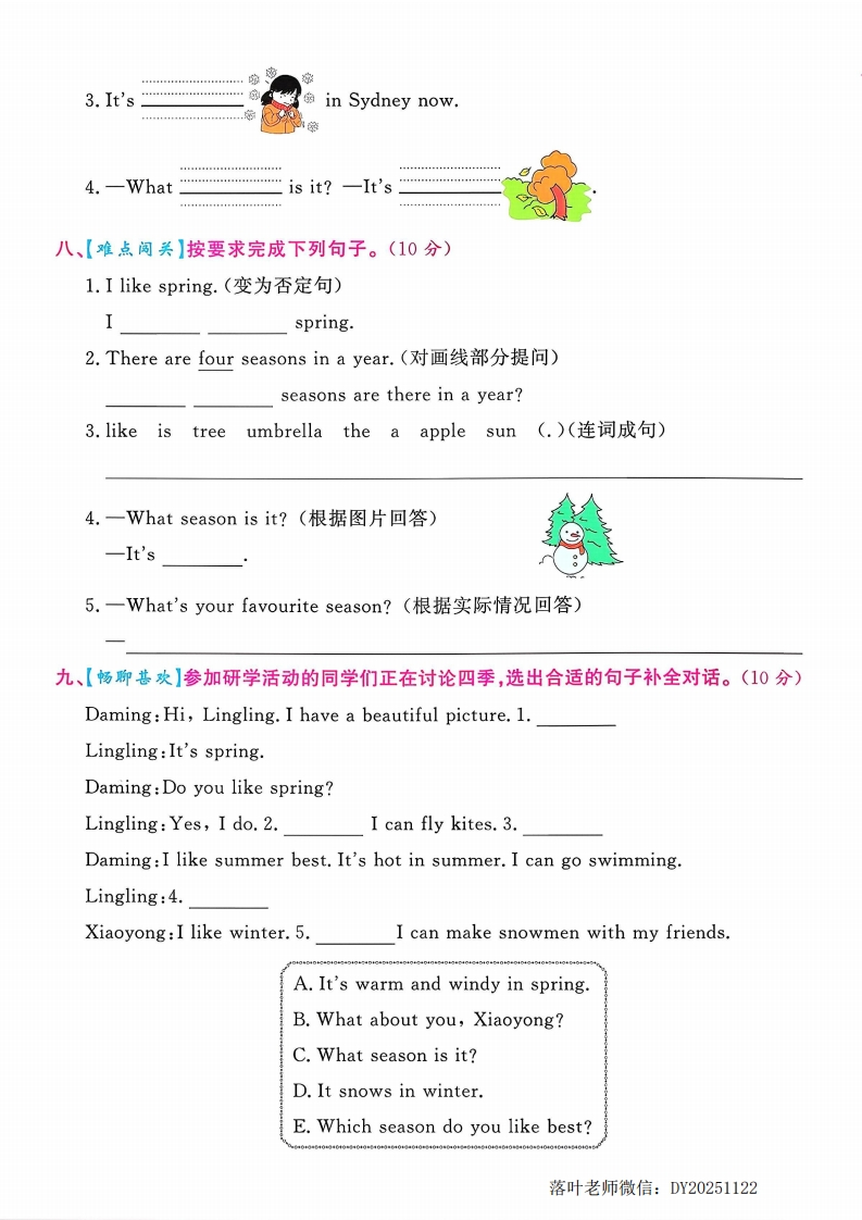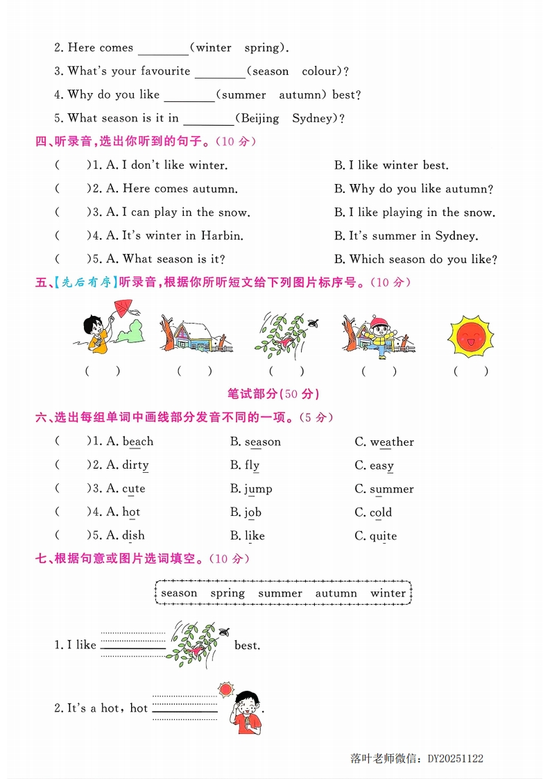 2025外研版四年级英语上册单元测试卷Unit 4综合素养过关卷时间:60分钟书写等级:质量等级:▣▣听力部分(50分】[所力箭频的一、听录音,选出你听到的单词。(10分)瑞()1.A.summerB.springC.autumn()2.A.birthdayB.dayC.today()3.A.equatorB.snowstormC.beach()4.A.quiteB.seasonC.diary)5.A.specialB.surpriseC.favourite二、【听音选图】听录音,选出与你所听句子相符的图片。(10分))1.A量)2.)3.A.如)4.A)5.A三、听录音,圈出你听到的单词。(10分)1.The weather is(veryquite)cold落叶老师微信:DY20251122
