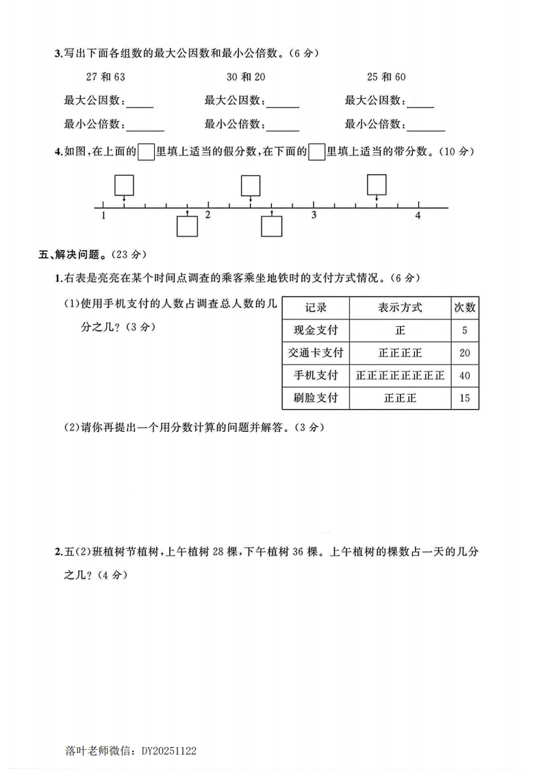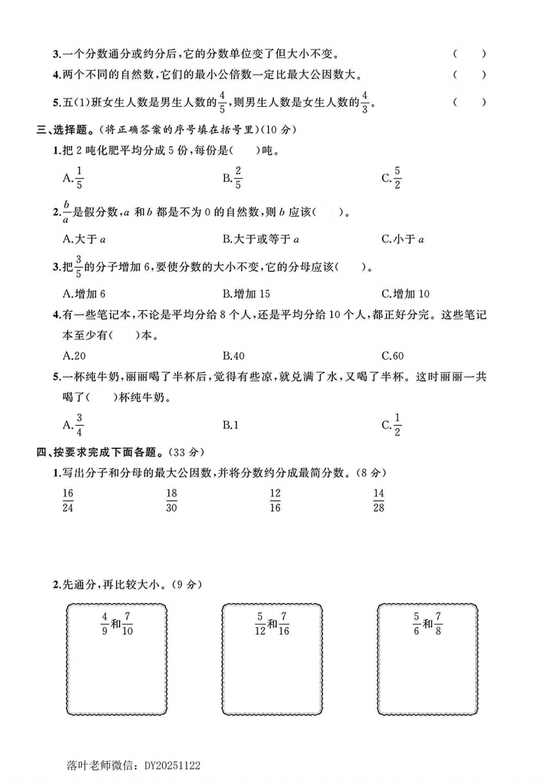 2025北师大版五年级数学上册单元试卷第五单元测试卷时间:90分钟满分:100分+10分题序二三四五附加题总分得分一、填空题。(每空1分,共24分):1.用分数表示下列图形中的阴影部分的大小。弥封靠线2爱里有()个10个是(),()个是1.3.()÷5=4()3030内4.2的分数单位是(),它含有()个这样的分数单位,再添上()个这样的分数单位就是最小的合数。不5.20以内既是奇数又是合数的2个数,它们分别是()和(),它们的最大公因数是(),最小公倍数是()。6.两根彩带分别长45cm和30cm,把它们剪成长度一样的短彩带且没剩余,每根彩带最要长是()cm。7.把20个苹果平均分给6个小朋友,每个小朋友分得这些苹果的(),每人分得答()个苹果。题8在(○里填上“>”“<”或“=”。0○品1209-69.笑笑在化简一个分数时,连续用2约分两次,再用3约分一次,得到的分数号原来的分数是()。:二、判断题。(对的画“√”,错的画“X”)(10分)1.分数的分母越大,它的分数单位就越大。(2.真分数比1小,假分数比1大。落叶老师微信:DY20251122