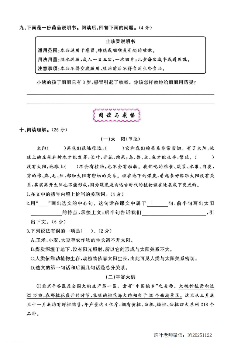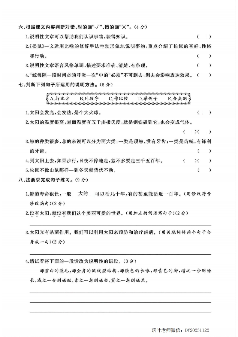2025人教版五年级语文上册单元测试卷第五单元测试卷:时间:90分钟满分:100分:题序三四五六七八九十一总分咖得分础固弥一、读拼音,写词语。(8分)l.动物的生存、liang shi()的生长、meitàn()的形成都离不开太阳。不仅封如此,太阳光还能shajūn(),人们可以利用它来预防和zhiiáo()疾病。靠2.松鼠有着ling l6ng()的小面孔,白天喜欢躲在窝里xi讵idng(),晚上出线来zhui zhu()玩耍,吃东西。它的窝开口朝上,很xia zhǎi(二、用“/”画出加点字的正确读音。(3分)树权(chacha)治疗(Iiaoliao)飘浮(位f6)内矫健(jiaojiao)追逐(zhuzhu)杀菌(junjùn)紧三、选字填空。(4分)不殖值(要)尺生()日养蔬答)头稀(菜)远盟四、查字典填空。(3分)题查“勉”字,用音序查字法应先查音序,再查音节。“勉”字在字典中的解释有:①勉励,使人努力;②勉力,力量不够还尽力做。“勉为其难”中的“勉”应选第种解释。五、用“烈”字组成恰当的词语填空。(4分)1.吃完饭,我们不能马上做()的运动。☒2.松鼠好像很怕()的日光,白天躲在窝里歇凉。3校长的话音刚落,台下就响起了一阵()的掌声。4.在辩论会上,正方和反方进行了()的辩论。落叶老师微信:DY20251122