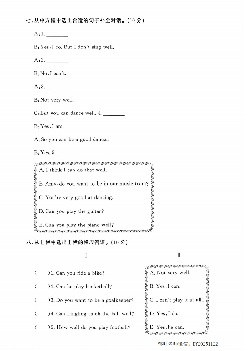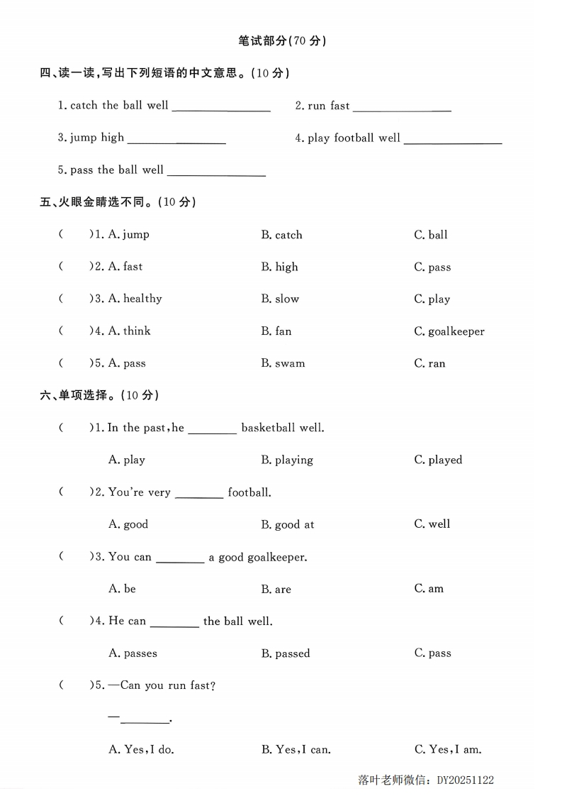 2025外研版五年级英语上册单元测试卷第六单元测试卷扫码听听力(检测时间:60分钟满分:100分)露题序三四五六七八九十总分得分听力部分(30分)密一、听录音,选出你所听到的单词或词组。(10分))1.A.wearB.wellC.wall毁封()2.A.thinkB.pinkC.thank线()3.A.panB.fourC.m内()4.A.swimB.swamC.warm童(不)5.A.glowB.blowC.slow二、听录音,为下列图片排序。(10分)要答靠题三、听录音,判断下列句子是(T)否(F)正确。(10分))1.Do you want to be in our football team?)2.You're a fantastic football player.()3.In the past,he jumped very high.()4.The black horse ran really fast.)5.Can you play football well?落叶老师微信:DY20251122