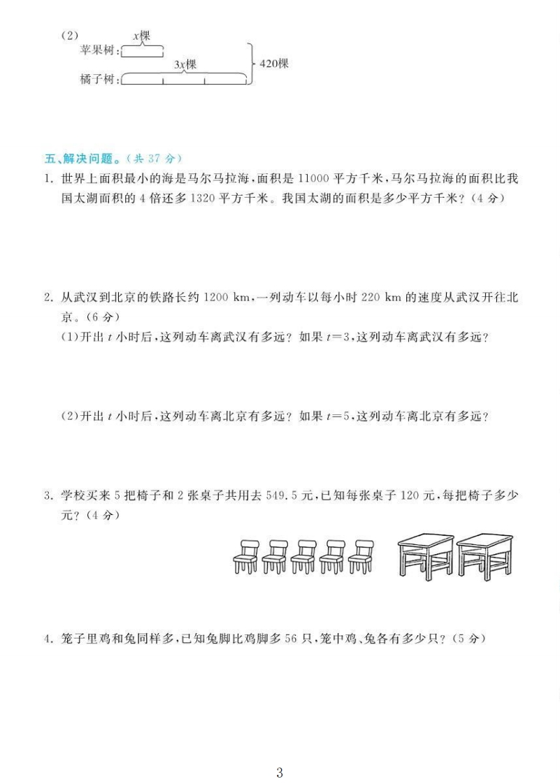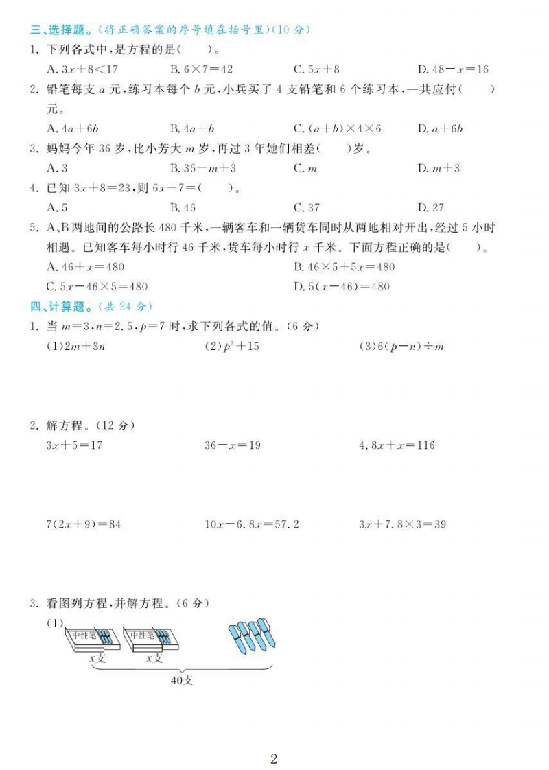 2025五年级数学上册第五单元测试卷第五单元测试卷的时间:90分钟满分:100+10分一、填空题。(第7题4分,其余每空1分,共23分)31.化简下面各式。x×4.6=(a×7Xb=(mXm×2.6=-(7.2x-3.8x=(x+6Xy=(yX1=(2.在括号里填上适当的式子。a与b的和的4倍。(a除以b的商与9的和。(比x的2.3倍少4.5的数。()4个m加上n。(3.我们每76年才能见到一次哈雷彗星。在公元S年出现后,再一次出现是公元()年4.用S表示长方形的面积,C表示长方形的周长,a表示长,b表示宽,则S=(C=(5.一堆煤共a吨,每天烧去b吨,10天后还剩下()吨。6.水果店运来梨x千克,运来苹果的质量是梨的4.7倍;运来苹果()千克,运来苹蓉果和梨一共()千克,苹果比梨多()千克。7.运用运算定律填空。(4分)x-78-22=xac+bc=(a+5.45·x·c=5·8.三个连续的自然数,中间的数是,那么另外两个数分别是()和(二、判断题。(对的画“/”,错的画“X”)(6分)1.方程一定是等式,但等式不一定是方程。2.因为22=2×2,所以a2=2a。3.在6.7÷x中“x”可以代表任何数。4.x的2倍比2.9少0.5,用方程表示是2x一2.9=0.5。5.x=5是方程3x十4=19的解。6.如果a+4=b+8,那么a>b。