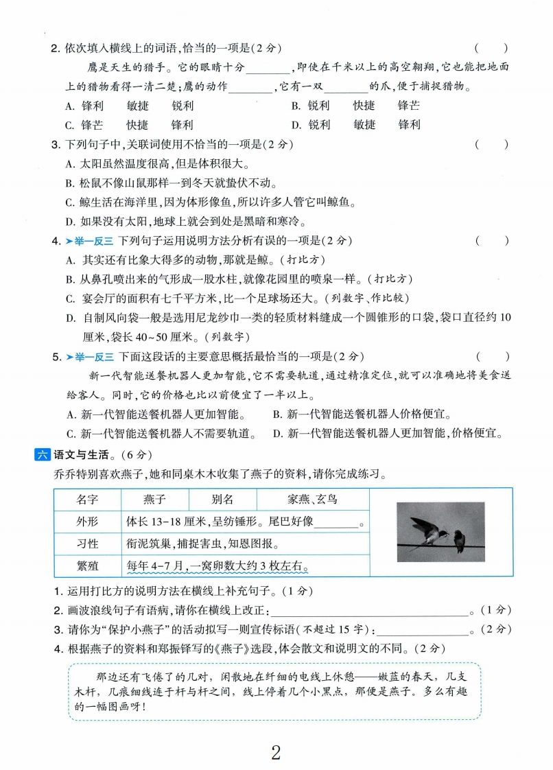 2025人教版五年级语文上册第五单元测试卷第五单元测试卷时间:90分钟满分:100分题号二三四五六七八九总分得分一认真听录音,边听边想,根据听力内容完成下列练习。(7分)密1.象海豹被称为动物界的“”,仅次于。(2分)2.海豹妈妈分娩的地点一般是,通过领封的方法让小海豹学会游泳和潜水。(3分)3.下列对海豹特点的概括不正确的一项是(2分)线A.拥有流线型身体和黝黑发亮的皮肤B.大海里分布最广、数量最多C.身材瘦小灵活,擅长游泳D.潜水本领高已根据拼音写词语。(9分)内1.松鼠是一种漂亮的小动物,性格guāiqiǎo(),很讨人喜欢,也很jing jue(2.他是这个kuang qu()的老板,为当地的yiiáo()事业提供了很多资金,这一善蕾不举chu dong()了人们的内心,弘扬了社会正能量。3.一天,我发现一只刺猬躲在xiáhi()的沟里。它长得xiǎo qiao ling long(),面要容ging xitù(),背后长满了刺,腹部的皮毛却很guang hua()。彐根据拼音和语境写同音字。(3分)答1.【zhi】珍珠蚌通过卵生繁()后代,它们产出的珍珠价()很高。2.【liang】秋天是丰收的季节,()食香甜的气味伴随着清()的风飘满田间屋舍。靠3.【ton】煤()不完全燃烧会产生一氧化(),可能会导致中毒。题四给下列加点字选择正确的解释。(填序号)(3分)“摄”在字典中的解释有:①吸取;②摄影;③保养:④代理(多指统治权)。1.清朝经历了叔王摄政、异姓大臣辅政两种特殊的政治体制。2.为了达到更好的效果,摄制组决定进入丛林取景。3.实验证明,虾摄食鱼卵这一事实,对天然鱼类的种群有一定的限制作用。五选择题。(10分)1.下列加点字读音完全正确的一组是(2分)A.蛰伏(zhé)歇凉(xi)圆锥(zui)B.长缨(yin)温驯(xùn)勉强(min)eC.树权(chà)捡拾(shi)榛子(zhen)D.苔藓(xian)矫正(jiǎo)褐色(hè)1