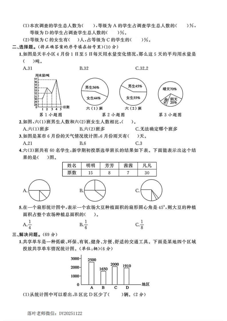 2025北师大版六年级数学上册单元试卷第五单元测试卷时间:90分钟满分:100分+10分题序二三附加题总分得分一、填空题。(每空1分,共21分)1.常用的统计图有()、()和()。2.要清楚地表达学校每个年级人数,用()统计图比较合适。要表示各年级人数占弥全校总人数的百分数,用()统计图比较合适。3.下图是某流感患者测量体温的统计图。封体温/℃40395靠39939.238N线375137.3683721内6:0012.0018400雪12.m01800时间1月27日1月28日1月29日量(1)医生每隔()时给患者测量一次体温。不(2)1月28日0时,病人的体温是()℃。(3)图中的虚线表示()。(4)从图中可以看出这位患者的病情()。要4.如图是六(1)班的图书角图书种类统计图。其他(1)这是一幅()统计图,用整个圆表示(文艺书漫画书35%)。答25%(2)从统计图中可以看出,()的数量最多,占图书总数量的科技书毁30%()%。(3)如果共有600本图书,则文艺书有()本,科技书有(题)本,漫画书有)本。5.课前预习是学习的重要环节,为了解班级学生数学课前预习的具体情况,洪老师对本班学生进行了为期半个月的跟踪调查,他将调查结果分为A(很好)、B(较好)、C(一般)、D(较差)四个等级,并绘制成如下两幅统计图。数量/人口男生☒回女生1BD等级落叶老师微信:DY20251122